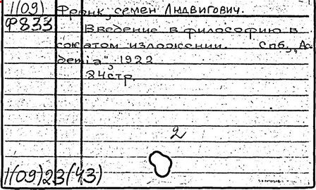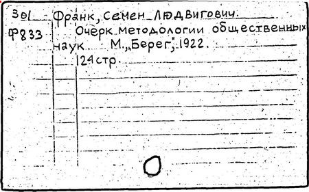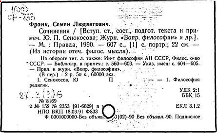 Основные работы Франка: Философия и жизнь, СПб., 1910; Предмет знания, 1915; Очерк методологии общественных наук, М., 1922; Живое знание, Берлин, 1923; Крушение кумиров, 1924; Духовные основы общества , 1930; Непостижимое. Париж, 1939; Реальность и человек. Метафизика человеческого бытия, Париж, 1956; Снами Бог, Париж, 1964.