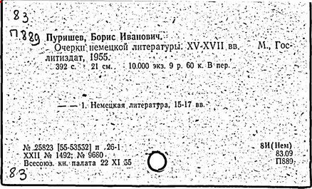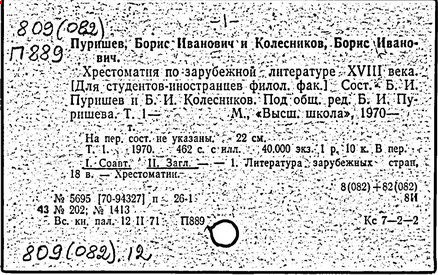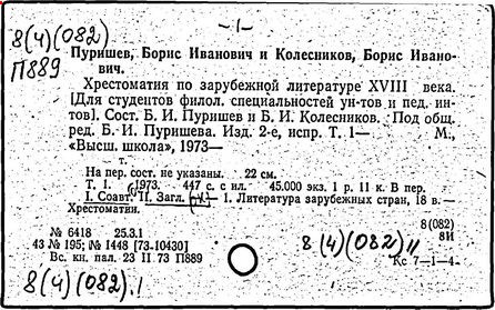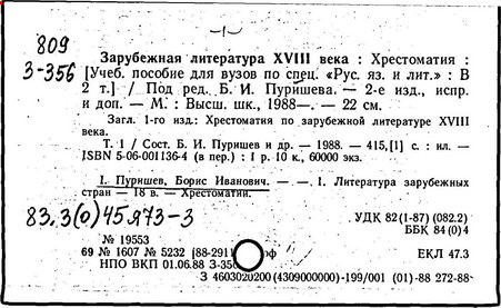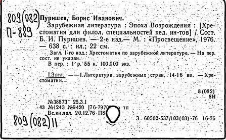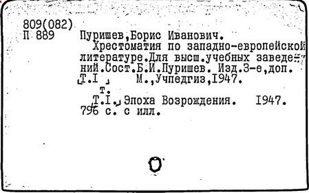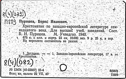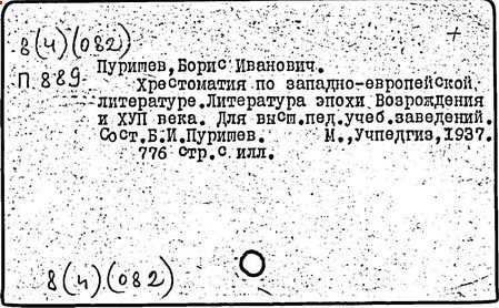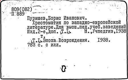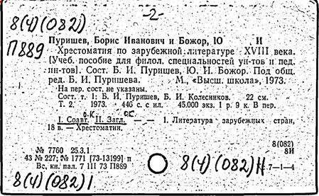 Литература: Штейн А. Хрестоматия по западноевропейской литературе XVII в. // Литературное обозрение. 1940. № 23; Верцман И.Е. Ценное исследование // Иностранная литература. 1956. № 6; Борис Иванович Пуришев: [некролог] // Научные доклады высшей школы. Филол. науки. 1989. № 7.