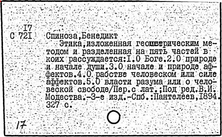 Главное сочинение Спинозы - "Этика" (1677 г.), составлено наподобие учебника геометрии: содержит пять частей, каждая из которых состоит из определений, аксиом и постулатов, теорем и лемм, короллариев (выводов) и схолий (пояснений). Основная цель сочинения - помочь человеку выработать линию индивидуального поведения, открыть путь к свободной жизни. Согласно Спинозе, человек - целостное, природное существо, у которого душа и тело как атрибуты единой субстанции нераздельны и определяются одними и теми же материальными причинами. По мнению Спинозы, порядок и связь идей те же, что порядок и связь вещей. Воля, как и остальные психические процессы, строжайшим образом детерминирована, а иллюзия её свободы возникает из-за незнания причин человеческих действий. Свободными эти действия являются тогда, когда они совершаются на основе знания необходимости, причём, чем активнее человек, тем в большей степени он свободен. В природе человека заложено стремление к самосохранению. Оно выражено в особом духовно-телесном акте - влечении, которое совместно с двумя первичными эмоциями - радостью и печалью лежит в основе всего многообразия мотивов и чувств человека. Радость увеличивает способность тела к действию, печаль ограничивает её. Спиноза полагал, что чувства возможно рассматривать с такой же точностью, как рассматриваются линии и поверхности в геометрии. Низший вид знания - чувственный опыт, более высокий - рациональное знание, высший - интуитивное. Философскую систему Спинозы завершает этическая концепция, в центре которой - понятие "свободного человека", руководствующегося в своей деятельности только разумом.