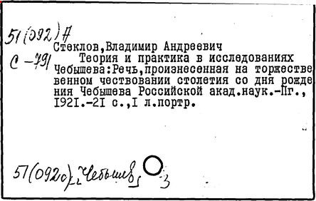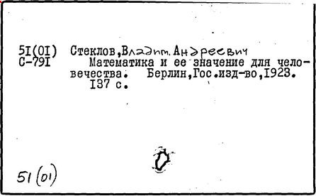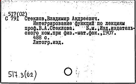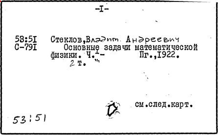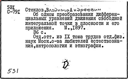 российский математик, академик (1912 г.; член-корреспондент 1902 г.). В 1919 – 1926 гг. вице-президент Академии наук СССР. Родился в Нижнем Новгороде. В 1887 г. окончил Харьковский университет, где учился у А. М. Ляпунова. В 1889 – 1906 гг. работал на кафедре механики в Харьковском университете, сначала в качестве ассистента, затем приват-доцента (с 1891 г.) и профессора (с 1896 г.). В 1893 – 1905 гг. был преподавателем теоретической механики Харьковского технологического института. В 1894 г. защитил магистерскую диссертацию "О движении твердого тела в жидкости" (изд. 1893 г.), а в 1902 г. – докторскую диссертацию "Общие методы решения основных задач математической физики" (изд. 1901 г.). В 1906 г. Стеклов перешёл на работу в Петербургский университет. Вёл большую общественную и научно-организационную работу, особенно в последние годы жизни. По его инициативе организован при Академии наук Физико-математический институт (в 1921 г.), директором которого он состоял до конца своей жизни. В 1926 г. имя Стеклова было присвоено Физико-математическому институту, который в 1934 г. разделился на два института (один из них – Математический институт Российской Академии наук – сохранил имя Стеклова).