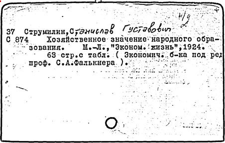 Струмилин показал сравнительную экономическую выгоду образования для работников умственного труда - 7-летняя школа обеспечила служащему повышение квалификации в 2,5 раза больше, чем рабочему. Для рабочего обучение в школе 2-й ступени лишь на 14% окупало государственные затраты, а высшая школа с 3-го курса становилась убыточной. Сформулировал закон "убывающей продуктивности школьного обучения", согласно которому с возрастанием количества ступеней обучения снижается его экономическая рентабельность для государства, а квалификация рабочих повышается медленнее, чем число лет, затраченных на его обучение.