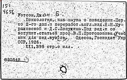 американский психолог, основоположник бихевиоризма. Специалист в области психофизиологии, экспериментальной и сравнительной психологии, психотерапии. Образование получил в Колледж Фурмана (бакалавр, 1900 г.) и Чикагском университете (доктор, 1903 г.). Профессиональную деятельность начал в качестве ассистента по психологии Чикагского университета (1903-1904 гг.), затем преподавателя (1904-1908 гг.). В 1908 г. получил приглашение Дж. Болдуина занять должность профессора в университете Джона Хопкинса и возглавить лабораторию сравнительной психологии. В 1909 г. в связи с отставкой Дж. Болдуина Уотсон занял его место декана факультета психологии и редакторские должности в нескольких психологических журналах (1909-1920 гг.). В 1915 г. Утсон был избран Президентом АРА. В этот период его окружала группа сотрудников (в том числе, Г.С. Дженнингс, К. Лэшли, Найт Данлел, Адольф Мейер и др.), которые, как и Уотсон, критически относились к господствующему методу интроспекции, как основному источнику фактов. Особенно остро этот конфликт выглядел в области психологии животных. Поскольку суть психологии сводилась к изучению сознания непосредственно через интроспекцию, психология животных занимала второстепенное положение по сравнению с экспериментальной психологией человека. При этом практическое применение интроспективной психологии было неясным, неопределенным. Преодолевая подобное положение, Уотсон выдвинул альтернативную стратегию, которая переориентировала психологию так, что работе с животными стало уделяться первостепенное внимание с соответствующими практическими последствиями. Начал Уотсон с публикации в 1913 г. статьи «Psychology as the behaviorist sees It» («Психология с точки зрения бихевиориста») в журнале «Psychological Review», которая стала своеобразным манифестом нового направления. С этого момента психологи США стали постепенно определять себя как сторонников или противников новой теории. В 1914 г. Уотсон публикует книгу «Behavior: An introduction to comparative psychology» («Поведение: введение в сравнительную психологию»), в которой впервые в истории психологии был решительно опровергнут постулат о том, что предметом этой науки является сознание (его содержание, процессы, функции и т.д.). Девизом бихевиоризма стало понятие о поведении как объективно наблюдаемой системе реакций организма на внешние и внутренние стимулы. Новый подход намечал перспективу раскрытия факторов взаимодействия целостного организма со средой и причин, от которых зависит динамика этого взаимодействия. Предполагалось, что знание причин позволит в психологии осуществить идеал других точных наук с их девизом предсказание и управление. Уотсон пришел к убеждению, что наблюдения за состояниями сознания также мало нужны психологу как и физику, химику и т.д. Только отказавшись от этих внутренних наблюдений, настаивал он, психология станет точной и объективной наукой, подобной другим естественнонаучным дисциплинам. По его плану, все поведение должно быть объяснено из отношений между непосредственно наблюдаемыми воздействиями физических раздражителей на организм и его, также непосредственно наблюдаемых ответов (реакций). Отсюда и главная формула Уотсона, воспринятая бихевиоризмом: стимул-реакция (S—R). Из этого следовало, что процессы, которые происходят между составляющими этой формулы (как физиологические, 