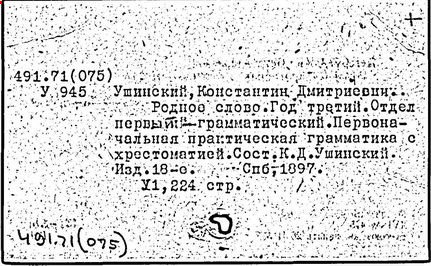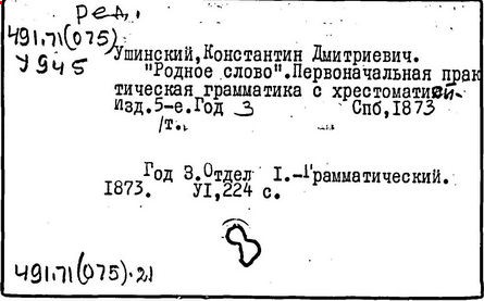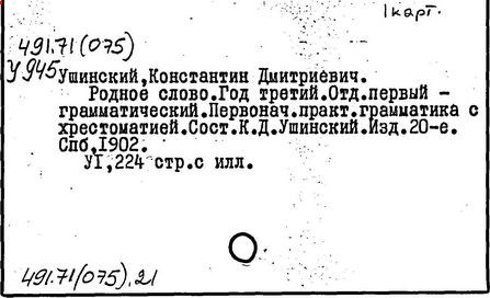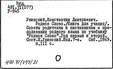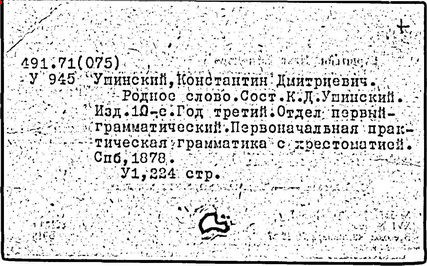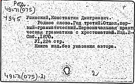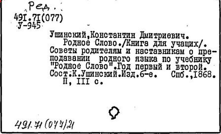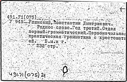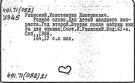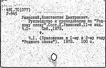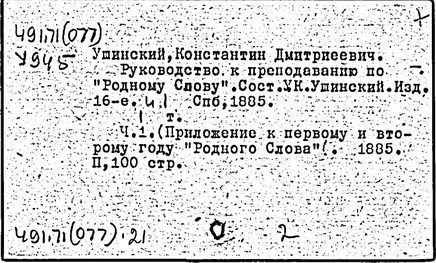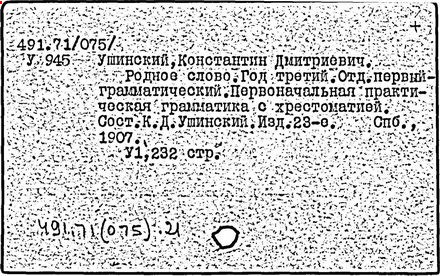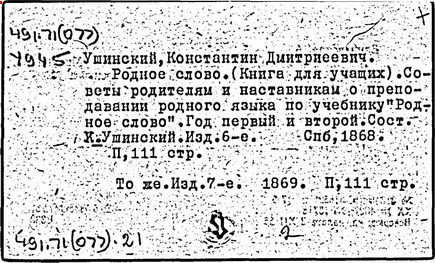 Большое внимание Ушинский уделял родному языку в школе, в котором "...одухотворяется весь народ и вся его родина". В книги для первоначального классного чтения "Детский мир и хрестоматия" (1861 г.) и "Родное слово" (1864 г.) он кроме отрывков из художественных произведений родной литературы и устного народного творчества включил так называемые деловые статьи, дававшие материал по природоведению, географии и истории страны. Научность знаний здесь сочеталась с доступностью и яркостью изложения, служила задачам нравственного и эстетического воспитания. В них дан содержательный материал для наблюдений, разработана система логических упражнений. В методических руководствах для учителей Ушинский рассмотрел основы методики начального обучения. Огромны его заслуги во внедрении в школу нового, аналитико-синтетического звукового метода обучения грамоте, который применяется и в современный отечественной школе.