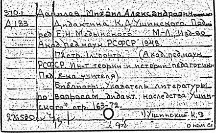 Литература: Лордкипанидзе Д. О., Педагогическое учение К. Д. Ушинского, M., 1954; Данилов М. А., Дидактика К. Д. Ушинского, М. - Л., 1948; Струминский В. Я., Основы и система дидактики К. Д. Ушинского, М., 1957; его же, Очерки жизни и педагогической деятельности К. Д. Ушинского, М., 1960; Гончаров Н. К., Педагогическая система К. Д. Ушинского, М., 1974; Советская педагогика, 1974, № 2 (номер посвящен Ушинскому); Очерки истории школы и педагогической мысли народов СССР. Вторая половина 19 в., под ред. А. И. Пискунова, М., 1976, гл. 12; К. Д. Ушинский и русская школа. Беседы о великом педагоге, под ред. Е. П. Белозерцева, М., 1994.