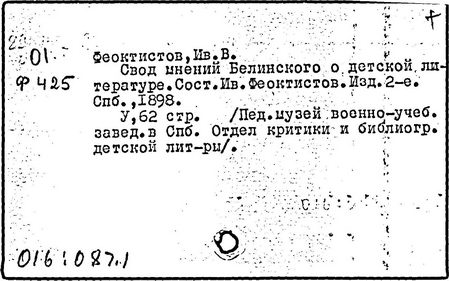 Один из главных образовательных факторов Белинский видел в детском чтении, отводя особую роль детской литературе: "Книги, которые пишутся собственно для детей, должны входить в план воспитания как одна из важнейших его сторон". Посвятив проблемам литературы для детей и юношества около 200 статей и рецензий, Белинский заложил основы научной теории и критики детской литературы, впервые обосновал положение о единстве педагогических и эстетических критериев в подходе к детской книге. Он требовал от детских писателей "не искажать действительности ни клеветами на неё, ни украшениями от себя", а показывать правдиво, "во всём её очаровании и во всей её неуловимой суровости, чтобы сердце детей, научась её любить, привыкало бы в борьбе с её случайностями находить опору в самом себе". Выступая против ограничений детской литературы в содержании, Белинский подчёркивал вместе с тем, что избирал "предметы те же, что и для взрослых", писатель должен их "излагать сообразно с детским понятием". Подлинно образцовыми детскими отечественными книгами Белинский считал сказки Пушкина, дедушки Иринея (В. Ф. Одоевского), басни Крылова, сборники народных сказок, пословицы и поговорки.