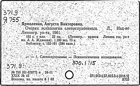 российский психолог, дефектолог, доктор педагогических наук (1955), профессор ЛГУ, специалист в области исследования слепоглухонемоты. После окончания дошкольного факультета Высшего педагогического института в Екатеринославле (Краснодар) продолжала обучение на психологическом факультете Петроградского психоневрологического института, который закончила в 1924 г. Огромное значение на формирование ее научных взглядов оказал создатель и руководитель института — В. М. Бехтерев. С 1923 по 1948 г. работала в отделении психологии Института мозга, одновременно читала курс по общей психологии в вузах Ленинграда, в том числе в ЛГУ. С 1923 г. вела систематические наблюдения за восемью слепоглухими воспитанниками первой в России школы для слепоглухих, которая после революции вошла в состав Отофонетического института (позднее — Института слуха и речи в Ленинграде). Слепоглухие дети обучались здесь совместно с глухими и слабослышащими. Результаты этих исследований были обобщены Ярмоленко в докторской диссертации, посвященной проблеме познавательной деятельности слепоглухонемых (1931). В 1934 г. слепоглухие дети вновь были выделены в отдельную группу и Ярмоленко вела систематическое научное изучение этой группы до 1941 г. («К истории обучения и воспитания слепоглухонемых» / Слепоглухонемота / под ред. М. Л. Шкловского, 1947; «Очерки психологии слепоглухонемых», 1961). В 1960-е гг. занималась проблемами логоневрозов и нарушениями речи при многоязычии. В соавторстве с Б. Г. Ананьевым и др. участвовала в создании монографии «Осязание в процессе труда и познания» (1961). Будучи профессором кафедры общей психологии ЛГУ, читала курсы общей, педагогической и юридической психологии, а также «Основы дефектологии».