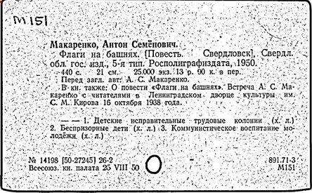 Педагогический опыт Макаренко, его педагогические взгляды отражены в художественном творчестве. Деятельность Колонии им. М. Горького описана в "Педагогической поэме" (части 1-3, 1933-1935 гг.), Коммуны им. Ф, Э. Дзержинского - в повести "Флаги на башнях" (1938 г.). Воспитанию в семье посвящена "Книга для родителей" (1937 г., совместно с Г. С. Макаренко).