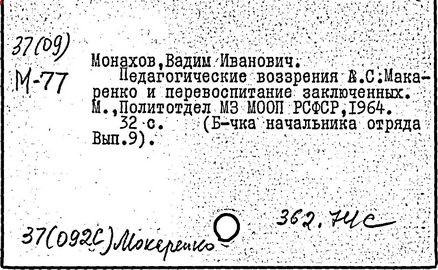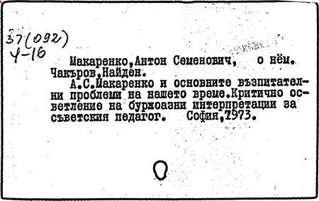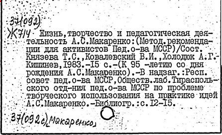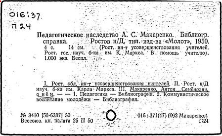 Литература: Воспоминания о Макаренко. Сборник материалов, Л., I960; Балабанович E. H., А. С. Макаренко. Человек и писатель, М., 1963; Жураковский Г. Е., Педагогические идеи А. С. Макаренко, М., 1963; Организация воспитательного процесса в практике А. С. Макаренко, Г., 1976; Павлова М. П., Педагогическая система А. С. Макаренко и современность, М., 1980; Педагогическое наследие А. С. Макаренко и современная школа, Воронеж, 1981; Творческое использование идей А. С. Макаренко и В. А. Сухомлинского в формировании педагогического мастерства, Полтава, 1983; IIатаки Ф., Хиллиг Г., Самоутверждение или конформизм? К вопросу идейно-политического становления А. С. Макаренко, Марбург, 1987; Педагогическое наследие А. С. Макаренко и современные проблемы воспитания молодежи. [Тезисы докладов и сообщений Всесоюзной научно-практической конференции, посвященной 100-летию А. С. Макаренко], ч. 1 - 2, М., 1988; Фрадкин Ф. А., В поисках новых педагогических путей. (К столетию со дня рождения А. С. Макаренко), М., 1988; Фролов А. А., А. С. Макаренко и педагогика его времени, Г., 1988; Развитие идей А. С. Макаренко в теории и методике воспитания, М., 1989, А. С. Макаренко сегодня. Сост. А. А. Фролов, Н. Новгород, 1992; Хрусталева В. А., А. С. Макаренко. Библиографический указатель, М., 1959; А. С. Макаренко. Указатель трудов и литературы о жизни и деятельности, М., 1988; Nastainczyk W., Makarenkos Sowjetpadagogik, Hdeb., 1963; Ruttenauer I., A. S. Makarenko. Ein Erzieher und Schriftsteller in der Sowjetgesellschaft, Freiburg - Basel - W., 1965; Bernitt I., Zum Kollektiv: begriff in der Fruhsowjetischen Padagogik, в кн.: Makarenkc-Materi-alien, Bd l, Marburg, 1969; G l an t z T., Kollektiv und Einzelner, Marburg, 1963; № i 1-1 i g G., Die Verbreitung der Werke A. S. Makarenko au?erhalb der Sowjetunion, "Padagogische Rundschau", 1980, JM° 1; Sauermann E., Makarenko und Marx, B., 1987; Hundert Jahre Anton Makarenko, hrsg. von G. Hillig, Bremmen, 1988.