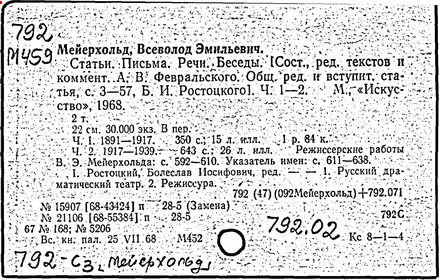 советский режиссёр и актёр, народный артист Республики (1923 г.). Родился в Пензе в семье предпринимателя, выходца из Германии. В 1895 г. поступил на юридический факультет Московского университета, в 1896 г. – на 2-й курс драматического класса Музыкально-драматического училища Московского филармонического общества; по окончании в 1898 г. вошёл в труппу Московского Художественного театра. Наиболее значительные роли Мейерхольда – Треплев, Тузенбах («Чайка», «Три сестры» Чехова), Иоганнес («Одинокие» Гауптмана), Мальволио, принц Арагонский («Двенадцатая ночь», «Венецианский купец» Шекспира). В 1902 г. Мейерхольд ушёл из МХТ; до 1905 г. возглавлял организованное им «Товарищество новой драмы» (Херсон, Николаев, Тбилиси), где выступил и как режиссёр. Здесь начала формироваться художественная программа Мейерхольда, связанная с поэтикой символизма, с принципами условного театра, стилизации, подчинения актёрского действия живописно-декоративному началу. Эта программа получила обоснование в работе Мейерхольда в Студии на Поварской (Москва, 1905 г.), созданной по инициативе К. С. Станиславского. Оценивая подготовленные Мейерхольдом спектакли («Смерть Тентажиля» Метерлинка и «Шлюк и Яу» Гауптмана), Станиславский считал, что здесь актёры являлись простой глиной для лепки красивых групп, мизансцен, с помощью которых Мейерхольд осуществлял свои интересные идеи. Наиболее полно выражение стилистики условного театра нашло в театре В. Ф. Комиссаржевской (Петербург), где в 1906 – 1907 гг. Мейерхольд был главным режиссёром. Продолжив режиссёрскую деятельность в Александринском театре (с 1908 г.), Мейерхольд ставил уже иную задачу – возрождение принципов «театра прошлых эпох»; стремился к сочетанию трагического гротеска с традициями народного площадного зрелища (в спектаклях «Дон Жуан» Мольера, «Маскарад» Лермонтова), что имело важное значение для его дальнейшей деятельности. В частности, стало основой экспериментальной работы Мейерхольда в Студии на Бородинской (с 1914 г., Петербург), где Мейерхольд поставил «Незнакомку» и «Балаганчик» Блока.