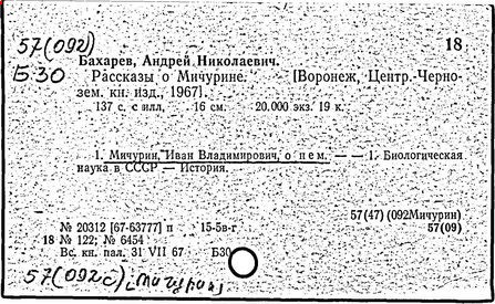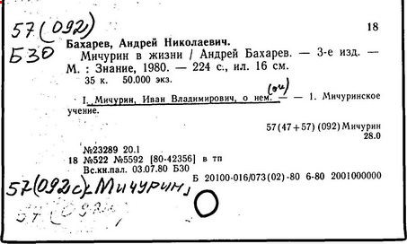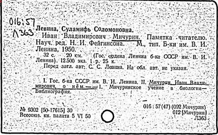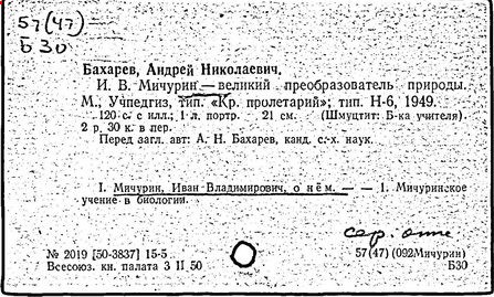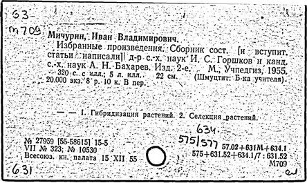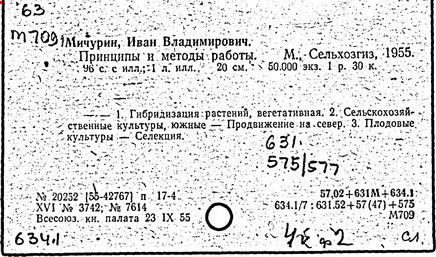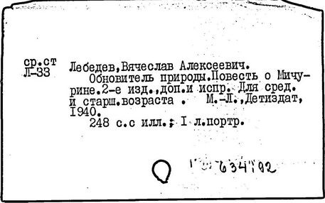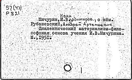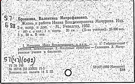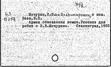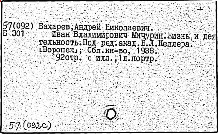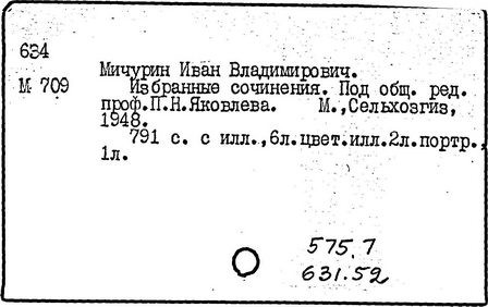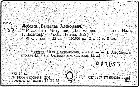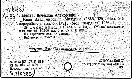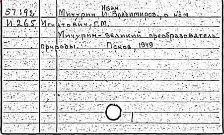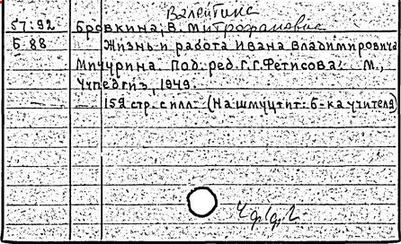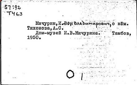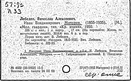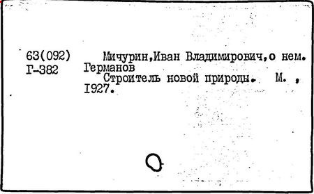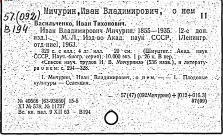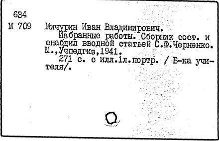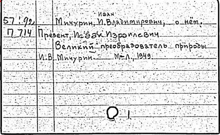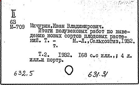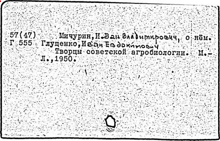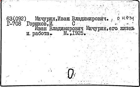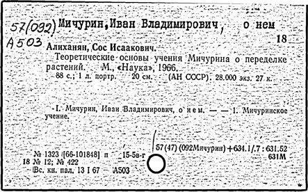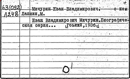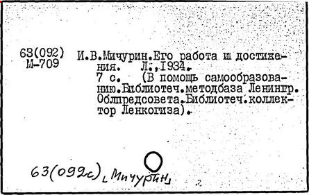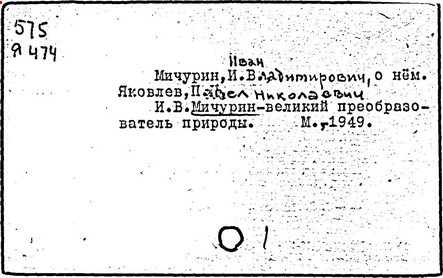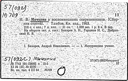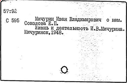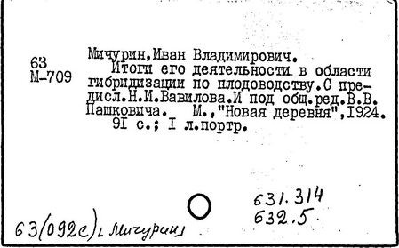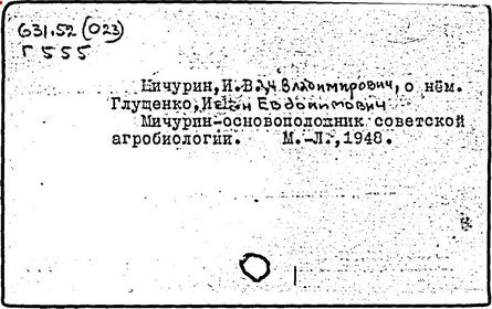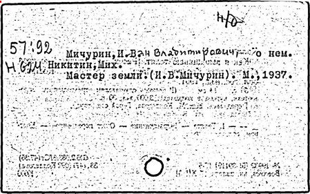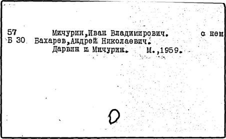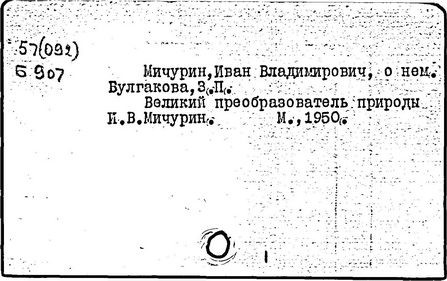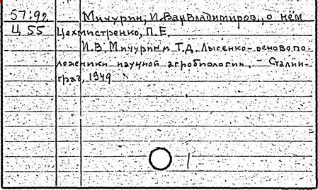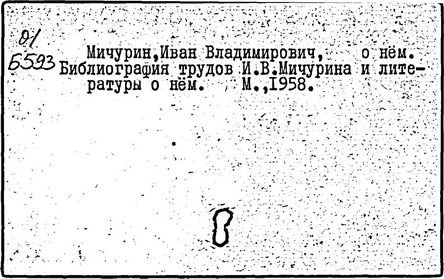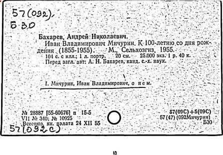 Литература: Лысенко Т. Д., Творец советской агробиологии, в его кн.: Агробиология. Работы по вопросам генетики, селекции и семеноводства, [6 изд.], М., 1952; Бахарев А. Н., Иван Владимирович Мичурин, М., 1949; Яковлев П. Н., Иван Владимирович Мичурин, М., 1951; Васильченко И., И. В. Мичурин, М.—Л., 1950; Люди русской науки, с предисл. и вступ. статьей акад. С. И. Вавилова, т. 2, М.—Л., 1948 (стр. 763—71); Геннель П. А., К столетию со дня рождения И. В. Мичурина, Ученые записки Московского областного педагогического ин-та", т. 41. Труды кафедры ботаники, 1956, вып. 1; Лысенко Т. Д., Сто лет со дня рождения И. В. Мичурина. Доклад..., 27 окт. 1955 г., "Труды Института генетики АН СССР", 1956. № 23; Цицин Н. В., И. В. Мичурин и значение его учения в современной биологии. [Доклад... окт. 1955]. "Бюллетень Главного ботанического сада", 1956, вып. 25.