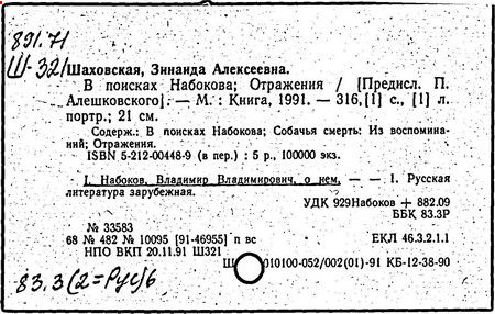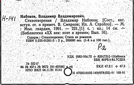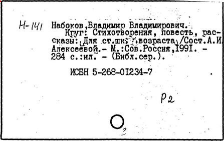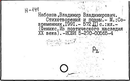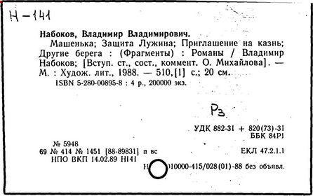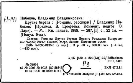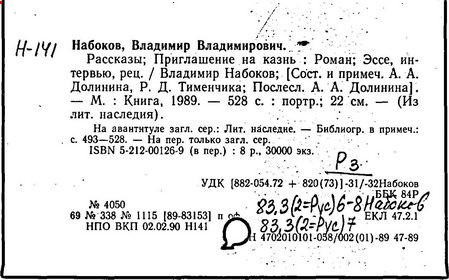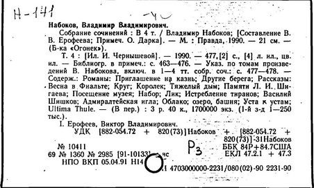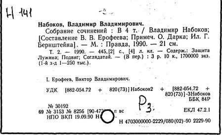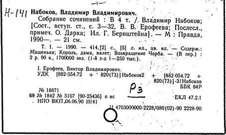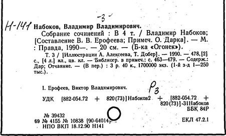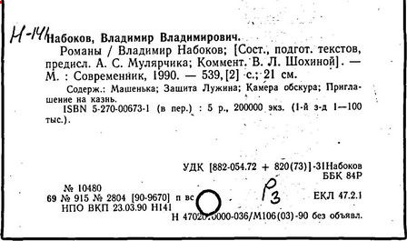 Литература: Набоков В.В. Возвращение Чорба (Рассказы). Ann Arbor, 1976; Набоков В.В. Соглядатай (Рассказы). Ann Arbor, 1978; Набоков В.В. Собрание сочинений, тт. 1-4. М., 1990; Набоков В.В. Круг. Л., 1990; Набоков В.В. Пьесы. М., 1990; Набоков В.В. Стихотворения и поэмы. М., 1991; Набоков В.В. Лекции по русской литературе. М., 1996; Набоков В.В. Лекции по зарубежной литературе. М., 1998.