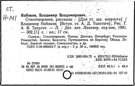 русско-американский писатель. Был также признанным энтомологом, специалистом по бабочкам. Родился в Санкт-Петербурге в аристократической семье. В 1919 г. Набоковы уехали из России. В 1922 г. Набоков окончил Кембриджский университет, где специализировался по зоологии и французской литературе, поселился в Берлине и под псевдонимом Владимир Сирин вскоре приобрел известность как один из ведущих литераторов русской эмиграции. В 1937 г. переехал во Францию, а оттуда в 1940 г. - в США. До 1959 г. читал лекционные курсы в американских колледжах и университетах; финансовый успех романа «Лолита» позволил ему оставить преподавательскую деятельность. Ранние произведения Набокова большей частью были написаны по-русски, а позже переведены на английский язык. За первым романом, «Машенька» (1926 г.; английская версия 1970 г. М. Гленни в сотрудничестве с автором) последовали «Король, дама, валет» (1928 г.; английская версия 1968 г.), «Защита Лужина» (1930 г.; английская версия 1964 г.), «Подвиг» (1932 г.; английская версия 1971 г.), «Камера обскура» (1932 г.; английская измененная авторская версия под названием «Laughter in the Dark» - «Смех в темноте», 1938 г.), «Отчаяние» (1936 г.; английская версия автора 1937 г.; второй перевод на английский язык, с изменениями, 1966 г.), «Приглашение на казнь» (1938 г.; английская версия 1959 г.) и «Дар» (1937 г.; английская версия 1963 г.). В этих книгах, как и в англоязычных произведениях Набокова, заметна склонность автора к пародии, игре слов, всяческого рода мистификациям. Первым большим произведением, написанным на английском языке, стал роман «Истинная жизнь Себастьяна Найта»(«The Real Life of Sebastian Knight», 1941 г.). К английским романам Набокова относятся также «Под знаком незаконнорожденных» («Bend Sinister», 1947 г.); «Пнин» («Pnin», 1957 г.); «Лолита» («Lolita», Париж, 1955 г.; Нью-Йорк, 1958; русская версия автора 1967 г.) - не укладывающееся ни в какие традиции, блестящее по нюансировке деталей повествование о средних лет европейце-интеллектуале, охваченном безрассудной страстью к двенадцатилетней американке; «Бледный огонь» («Pale Fire», 1962 г.; русский перевод Веры Набоковой, 1983 г.) - сатира на академический педантизм, представляющая собой поэму из 999 строк и комментарий к ней, якобы составленный сумасшедшим ученым из Новой Англии, который оказывается королем некоей мифической страны, коротающим свои дни в изгнании; «Ада, или Страсть: Хроника одной семьи» («Ada or Ardor: A Family Chronicle», 1969 г.) - сложное произведение, отчасти затрагивающее проблему природы времени; «Просвечивающие предметы» («Transparent Things», 1972 г.) - еще одно размышление о феномене времени; и «Посмотри, арлекины!» («Look at the Harlequins!», 1974 г.) - автобиографические записки вымышленного персонажа, русского писателя-эмигранта, по сути дела, повторяющего жизненный путь самого писателя. Набоков опубликовал два поэтических сборника на русском языке («Горний путь», 1923 г.; «Гроздь», 1923 г.) и один - на английском «Стихи» («Poems», 1959 г.). Его перу также принадлежат многочисленные рассказы, часть которых вошла в сборники «Набоковская дюжина» («Nabokov's Dozen», 1958 г.) и «Истребление тиранов и другие рассказы» («Tyrants Destroyed», 1975 г.). Кроме того, он написал критический очерк «Николай Гоголь» («Nikolai Gogol», 1944 г.); автобиографические заметки «Неоспоримое свидетельство» («Conclusive Evidence», 1951 г.); книгу воспоминаний «Память, говори» («Speak, Memory», 1966 г.; русская версия автора «Другие берега», 1951 г.). Его письма, интер