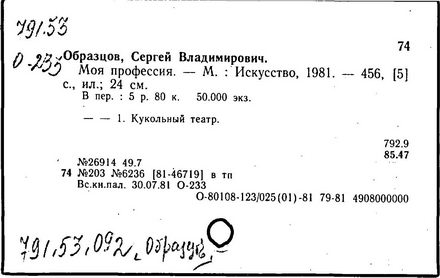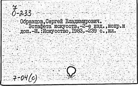 русский советский театральный деятель, актёр и режиссёр, народный артист СССР (1954 г.), Герой Социалистического Труда (1971 г.). Сын В. Н. Образцова. В 1918—1926 гг. учился на живописном факультете Высших художественных мастерских. В 1922—1930 гг.артист Музыкальной студии МХАТа (с 1926 г.— Музыкальный театр им. Немировича-Данченко), в 1930—1936 гг. — МХАТа 2-го, исполнял острохарактерные роли. В 1920 впервые выступил с куклами. К середине 30-х гг. становится популярным артистом эстрады. Выступает в пародийном жанре «романсы с куклами». В 1931 г. возглавил Государственный центральный театр кукол. Разработал теорию и методику этого театра, создал репертуар, воспитал творческие кадры актёров и режиссёров. Среди постановок для детей: «Каштанка» Сперанского (1935 г.), «По щучьему велению» Тараховской (1936 г.), «Лампа Аладдина» Гернет (1940), «Мистер Твистер» Маршака (1961 г.), «Тигрик-Петрик» Гернет (1965 г.); для взрослых — «Ночь перед рождеством», «Король-олень» Сперанского (1941, 1943 гг.), «Необыкновенный концерт» (1946 г.), «Чертова мельница» и «Божественная комедия» Штока (1953, 1961 гг.), «Новоселье» (1970 г.), «Говорит и показывает Центральный театр кукол» (1973 г.). С 1956 г. Образцов работает также в кино как сценарист и режиссёр. Среди фильмов: «Удивительное рядом» (1962 г.), «Кинокамера обвиняет» (1968 г.), «Невероятная правда» (1970 г.), «Кому он нужен, этот Васька!» (1973 г.). Вице-президент Международного союза кукольников (с 1957 г.), президент Советского центра этой организации (с 1958 г.). С 1935 г.(с перерывами) ведёт педагогическую работу (с 1973 г.профессор). Государственная премия СССР (1946 г. ), Государственная премия РСФСР им. К. С. Станиславского (1967 г.). Награжден 2 орденами Ленина, другими орденами, а также медалями.
