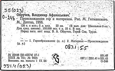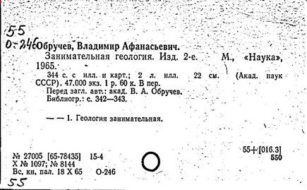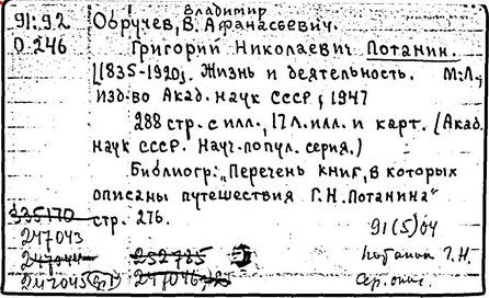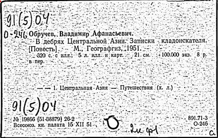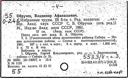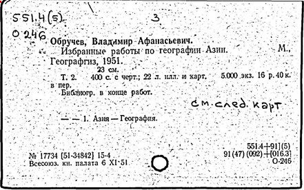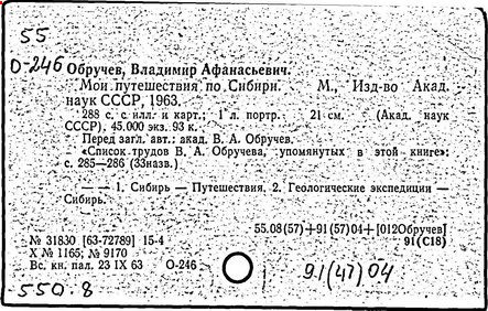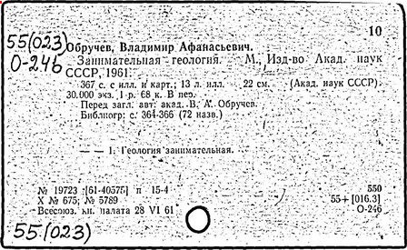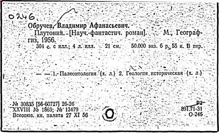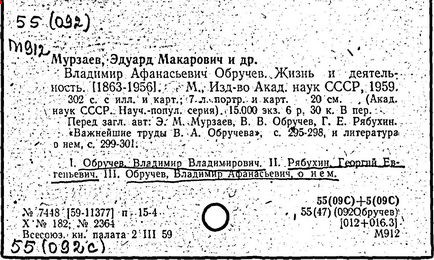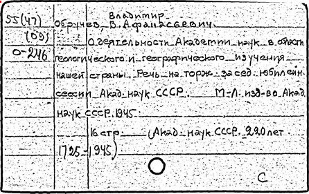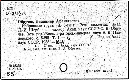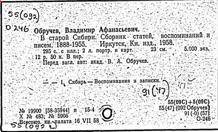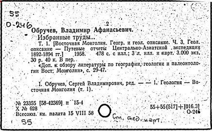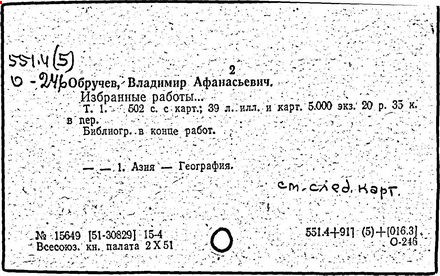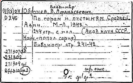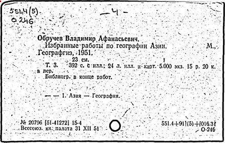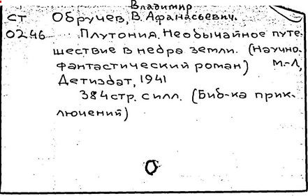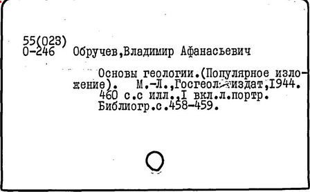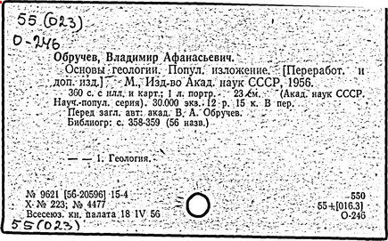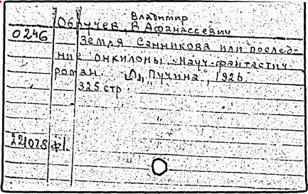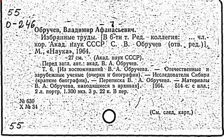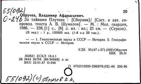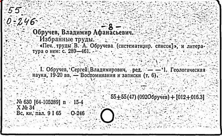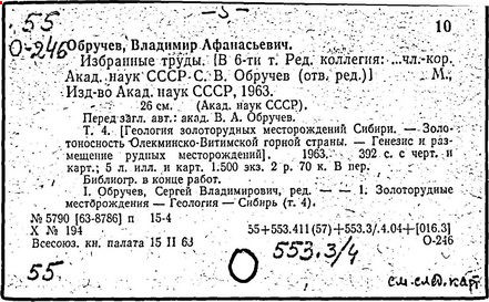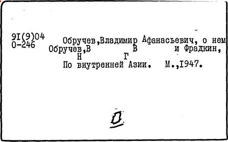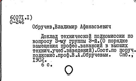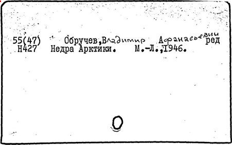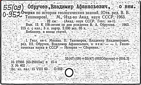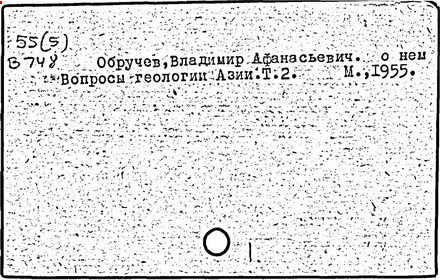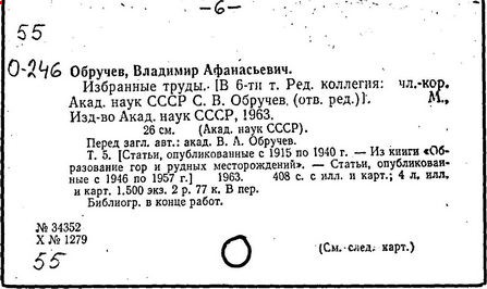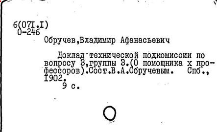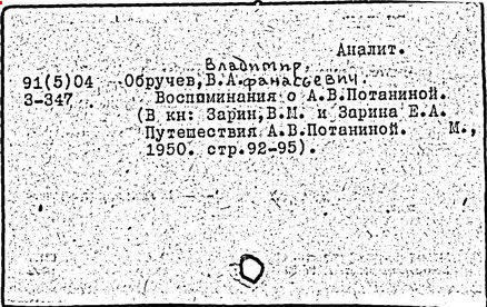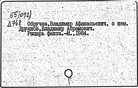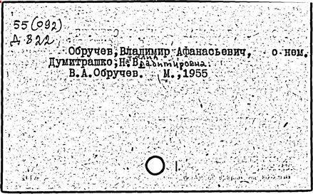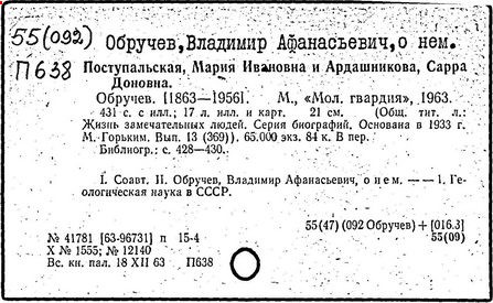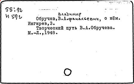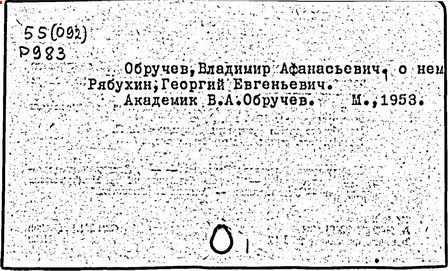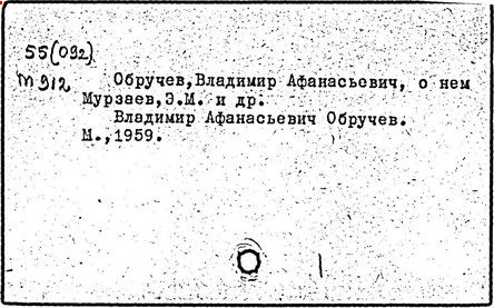 Литература: Владимир Афанасьевич Обручев. М.;Л., 1946 (АН СССР. Материалы к биобиблиографии учёных СССР. Серия геологических наук, вып. 6); Варсанофьева В. А. Памяти Владимира Афанасьевича Обручева // Бюллетень Московского общества испытателей природы. Отдел геологический. – 1956. – Т. 31, № 5; Поступальская М., Ардашникова С. Обручев. М., 1963.