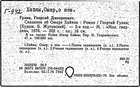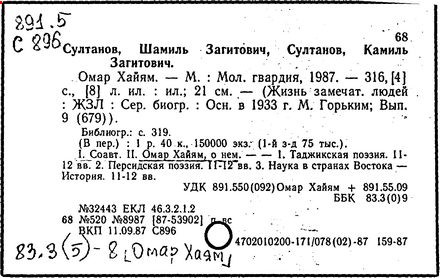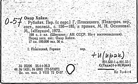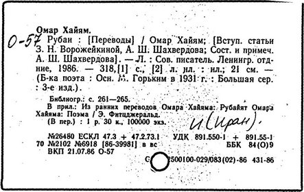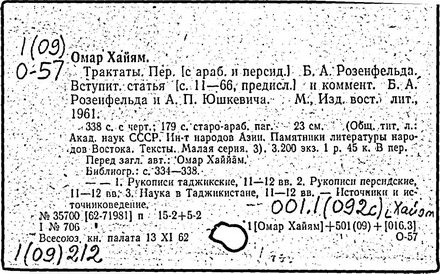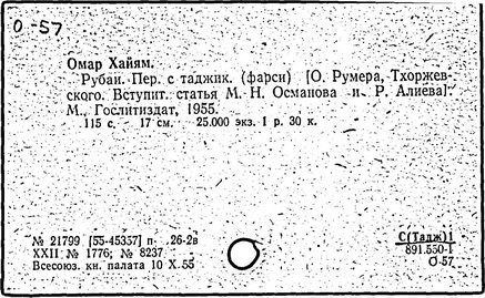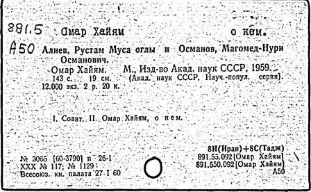 Литература: Морочник С. Б., Розенфельд Б. А., Омар Хайям - поэт, мыслитель, ученый, [Душанбе], 1957; Алиев Р. М., Османов М.-Н., Омар Хайям, М., 1959; Розенфельд Б. А., Юшкевич А. П., Омар Хайям, М., 1965; Swami Gowinda Tirtha, The nectar of grace. Omar Khayyam's life and works, Allahabad, [1941]; Али Дашти, Дами ба Хаййам, Тегеран, 1348 с. г. х. (1969); его же, In search of Omar Khayyam, L., 1971.