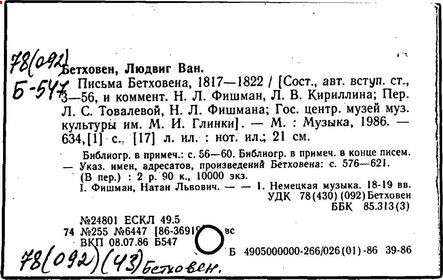 Сочинения: Ludwig van Beethoven's Werke, Bd 1‒25, Lpz., 1864‒88. Beethovens Sämt-liche Briefe, Bd I‒5, kritische Ausgabe mit Erläuterungen von A. Kalischer, B.‒Lpz., 1906‒08, 2 Aufl., Bd 1‒3, neubearb. von T. Frimmel, B., 1911; Leitzmann A., Ludwig van Beethoven. Berichte der Zeitgenossen. Briefe und persönliche Aufzeichnungen, Bd 1‒2, Lpz., 1921; The letters of Beethoven, ed. by E. Anderson, v. 1‒3, L., 1961: в рус. пер.‒ Письма, пер. и прим. В. Д. Корганова, СПБ. 1904.