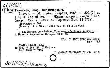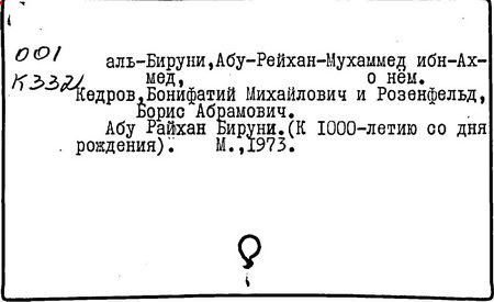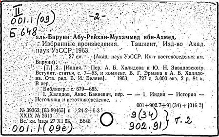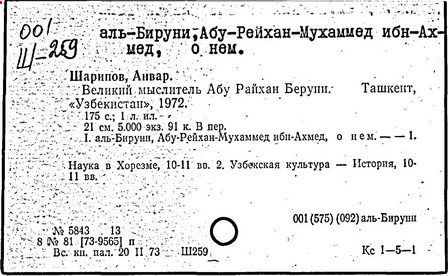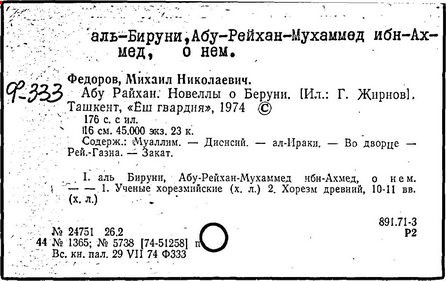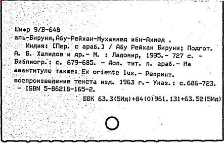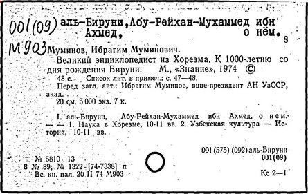среднеазиатский учёный-энциклопедист. Писал на арабском языке. Родился в Хорезме. В 1018 г. (или 1017) был увезён Махмудом Газневи в Газни, где оставался до конца жизни. Сочинения Бируни относятся к математике, астрономии, физике, ботанике, географии, общей геологии, минералогии, этнографии, истории и хронологии. В "Хронологии древних народов" Бируни даёт детальное описание календарных систем арабов, персов, евреев, греков и др. Его трактат "Ключ к астрономии" не разыскан, но сохранилось небольшое "Введение в элементы астрологического искусства", содержащее в популярной форме изложение основ математики и астрономии. В "Книге о нахождении хорд в круге" разработан ряд оригинальных математических методов и доказательств. В большом трактате по математической и описательной географии "Канон Масуда", между прочим, излагается тригонометрический метод определения географических долгот, близкий к современным триангуляционным геодезическим методам. Бируни принадлежит сведение задач о трисекции угла и удвоении куба к решению уравнений 3-й степени. Впервые на Среднем Востоке Бируни высказал мнение о возможности движения Земли вокруг Солнца, определил длину окружности Земли. Написал также обширный труд по топографии Средней Азии. Здесь особенно интересны его исследования изменений течения Амударьи в далёком геологическом прошлом. В сочинении "Правила нахождения удельных весов минералов" Бируни приводит ряд числовых данных, весьма близких к современным определениям. Исключительная образованность сочеталась у Бируни с передовыми для его времени взглядами. Он иронически относился к религиозным суевериям, выступал против вражды между народами. Исторический трактат Бируни об Индии ("Разъяснение принадлежащих индийцам учений, приемлемых рассудком или отвергаемых"), материал для которого был собран Бируни во время индийских походов Махмуда, является важным источником по истории Индии раннего средневековья.