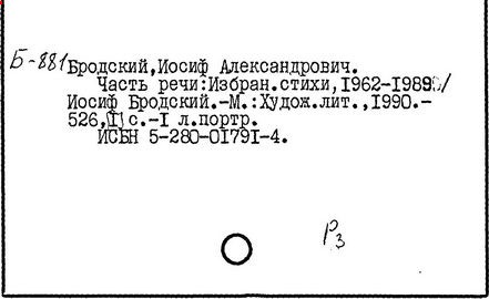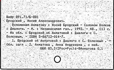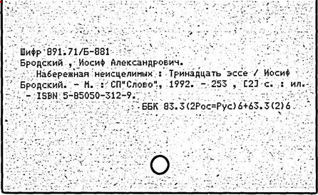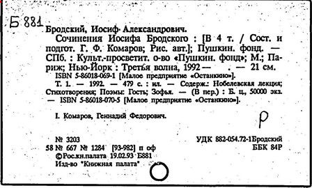 Литература: Бродский И. Часть речи. Избранные стихи 1962-1989 гг. М., 1990; Бродский И. Назидание. Л., 1990; Бродский И. Осенний крик ястреба. Л., 1990; Бродский И. Набережная неисцелимых. М., 1992; Сочинения Иосифа Бродского, тт. 1-4. СПб, 1992-1995; Бродский И. Пересеченная местность. М., 1995; Бродский И. Рождественские стихи. М., 1996; Бродский о Цветаевой. М., 1997.