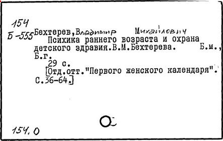 Лит.: Психика и жизнь, СПб, 1903; Личность и условия ее развития и здоровья, СПб, 1905; Объективная психология, в. 1-3, СПб, 1907 -10; Вопросы воспитания в возрасте первого детства, СПб, 1909; Вопросы обществ, воспитания, М., 1910; Значение музыки в эстетич. воспитании ребенка с первых дней его детства, М., 1916; О социально-трудовом воспитании. П., 1917; Культура социального героизма в воспитании детей. "Вестник знания", 1926, № 24; Общие основы рефлексологии человека, М. – Л., 1928; Мозг и его деятельность, М. - Л., 1928; Избр. произв., М., 1954; Объективная психология, М., 1991.