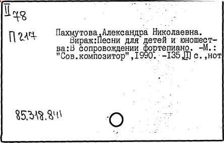 Особое значение имеет творчество Пахмутовой в жанре песни. Ею написано около 400 песен, среди которых широко известны "Песня о тревожной молодости" (1958 г.), "Старый клен" (1961 г.), "Орлята учатся летать" (1965 г.), "Трус не играет в хоккей" (1968 г.), "Беловежская пуща" (1975 г.), "До свиданья, Москва!" (1980 г.), "Русский вальс" (1992 г.) и многие другие. С 1968 по 1988 гг. возглавляла жюри Международного конкурса песни "Красная гвоздика"; с 1968 по 1991гг. – секретарь правления Союза композиторов СССР, с 1973 по 1995 гг. – секретарь правления Союза композиторов России. С 1969 по 1973 гг. была депутатом Моссовета, с 1980 по 1990 гг. – депутатом Верховного Совета РСФСР, избиралась членом Президиума Верховного Совета РСФСР. Народная артистка СССР (1984 г.); Герой Социалистического Труда (1990 г.); Лауреат Государственных премий (1975 г., 1982 г.) и премии им. Ленинского комсомола (1967 г.); в 1976 г. её именем названа малая планета № 1889. Замужем. Муж, Н. Н. Добронравов, – поэт, автор стихов многих её песен.