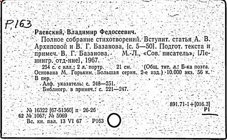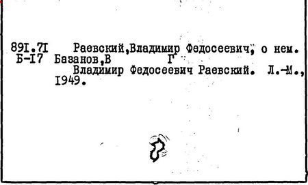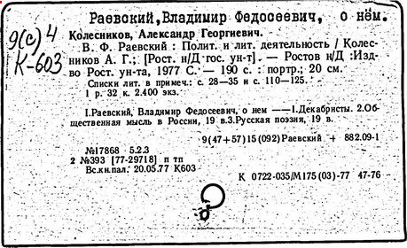 Литература: Щёголев П. Е., Первый декабрист Вл. Раевский, в его книге: Декабристы, М. - Л., 1926; Коваль С., Декабрист В. Ф. Раевский, Иркутск, 1951; Колесников А. Г., Поэт-декабрист Вл. Раевский, Бухарест, 1961.