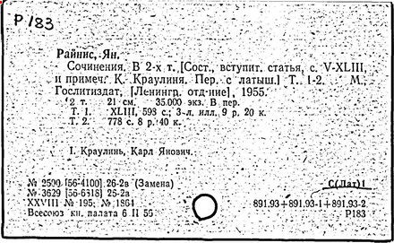 латышский поэт, драматург, общественный деятель, народный поэт Латвийской ССР (1940). Родился на хуторе Варславаны, (ныне Рубенский сельсовет Екабпилсского района) в семье арендатора имений. В 1884—1888 студент юридического факультета Петербургского университета. В Петербурге формировалось его материалистическое мировоззрение. Печатался с 1887. В 1891—1895 редактор газеты «Диенас лапа». Первые стихи опубликованы в 1895. В июне 1897 был арестован, в тюрьме закончил перевод на латышский язык «Фауста» Гёте. В декабре 1897 Райниса сослали в Псков, а в 1899 — в г. Слободской Вятской губернии. Здесь сложился сборник стихов «Далёкие отзвуки синим вечером» (1903).