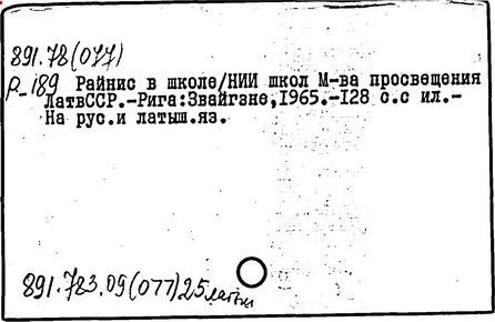 Литература: Дауге П., Ян Райнис. Певец борьбы, солнца и любви. М., 1920; Краулинь К., Ян Райнис, М., 1957: Сокол Э., Жизнь и творчество Яна Райниса, Рига, 1957; Kraulinš К., Raina dzive un darbiba, Riga, 1953; Sokols E., Rainis, Riga, 1962; Hausmanis V., Tautas dzejnieks Rainis, Riga, 1968; его же, Raina dailrades process, Riga, 1971; его же, Raina dramaturgija, Riga, 1973.