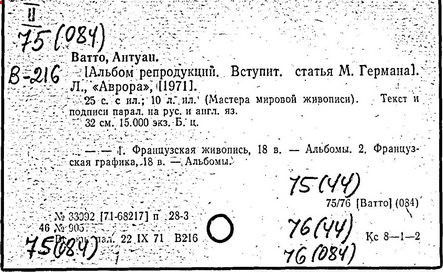 Литература: Алпатов М. В., Ватто, в его кн.: Этюды по истории западноевропейского искусства, 2 изд., М., 1963; Чегодаев А. Д., Антуан Ватто, М., 1963; Немилова И. С., Ватто и его произведения в Эрмитаже, Л., 1964; Adhémar Н., Watteau, sa vie – son œuvre, P., 1950; Parker K. T., Matheу J., Antoine Watteau. Catalogue complet de son œuvre dessiné, vol. 1-2, P., 1957.