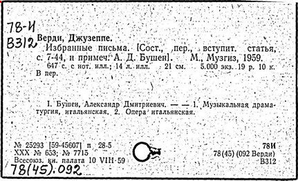 Сочинения: Избранные письма, пер. и вступ. статья А. Бушен, М., 1959. Литература: Соловцова Л., Джузеппе Верди, М., 1966; Нюренберг М., Джузеппе Верди. 1813-1901, 2 изд., Л., 1968;. Cherbuliez A. Е. A., Giuseppe Verdi. Leben und Werk. Z., 1949; Gatti C., Verdi, 2 ed., Mil.,1951: Abbiati F.. Verdi, v. 1-4, Mil., 1959.