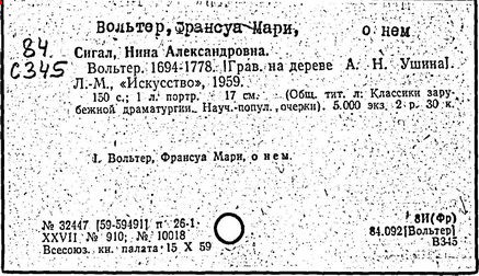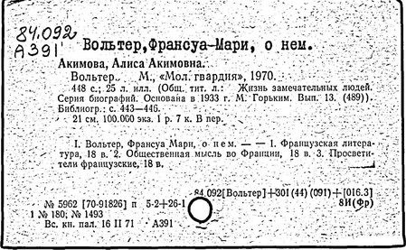 Литература: Морлей Д., Вольтер, пер. с англ., М., 1889; Шахов А., Вольтер и его время, СПБ, 1912; Державин К. Н., Вольтер, [М.], 1946; Вольтер. Статьи и материалы, под ред. М. П. Алексеева, Л., 1947; Вольтер. Статьи и материалы, под ред. В. П. Волгина, М. - Л., 1948; Артамонов С., Вольтер, М., 1954; Соколов В. В., Вольтер. Общественно-политические, философские и социальные воззрения, М., 1956; Сигал Н., Вольтер, Л. - М., 1959; Обломиевский Д., Французский классицизм, М., 1968; Акимова А. А., Вольтер, М., 1970; Desnoiresterres G., Voltaire et la société au XVIII siècle, v. 1-8, P., 1871-1876; Lion Н., Les tragédies et les théories dramatiques de Voltaire, P., 1895; Lanson G., Voltaire, P., 1906; Naves R., Le goût de Voltaire, P., 1938; его же, Voltaire, 7 éd., P., 1962; Bellesort A., Essai sur Voltaire, P., 1950; Lancaster Н. C., French tragedy in the time of Louis XV and Voltaire (1715-1774), v. 1-2, Baltimore, 1950; Díaz F., Voltaire Storico, Torino, 1958; Charpentier J., Voltaire, P., 1955; Studies on Voltaire and the 18th century, ed. by T. Besterman, v. 1-12, Gen., 1955-60 (изд. продолжается); Poneau R., La religion de Voltaire, P., 1956; его же, Voltaire par lui-même, P., 1963; Besterman Т., Voltaire essays and another, L., 1962; его же, Voltaire, [L. - Harlow, 1969]; Brailsford H. N., Voltaire, L., 1963; Gross R. H., Voltaire nonconformist, [L., 1968].
