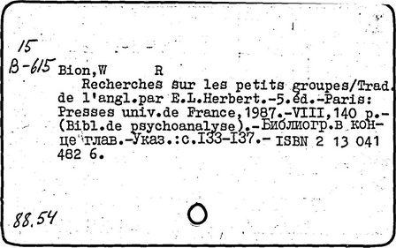 У. Бион – автор ряда работ, включая «Опыт в группах» (1961), «Научение через опыт переживания», «Элементы психоанализа» (1963), «Трансформация» (1965), «Вторичные мысли», «Внимание и интерпретация» (1970) и др.