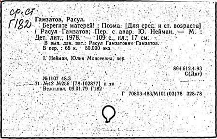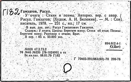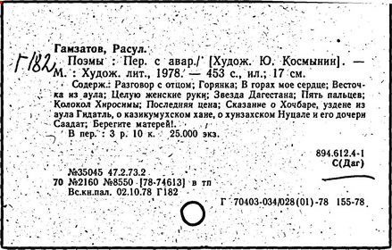 Стихи и поэмы Расула Гамзатова переводили на русский язык такие мастера пера, как Илья Сельвинский и Сергей Городецкий, Семен Липкин и Юлия Нейман. Особенно плодотворно работали с ним его друзья-поэты: Наум Гребнев, Яков Козловский, Яков Хелемский, Владимир Солоухин, Елена Николаевская, Роберт Рождественский, Андрей Вознесенский, Юнна Мориц, Марина Ахмедова и другие. Сам Расул Гамзатов перевел на аварский язык стихи и поэмы Пушкина, Лермонтова, Некрасова, Шевченко, Блока, Маяковского, Есенина, стихи поэтов Пушкинской плеяды, арабского поэта Абдул Азиз Ходжи и многих других.