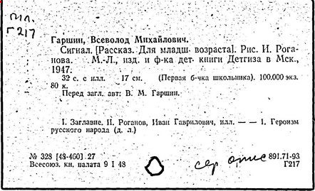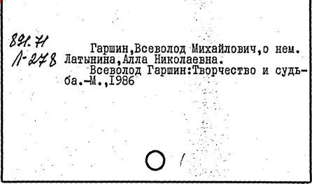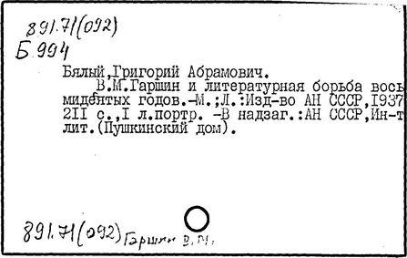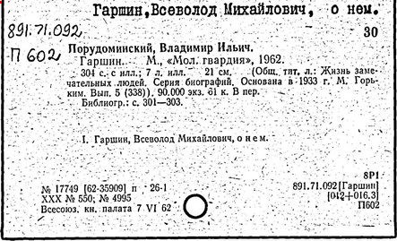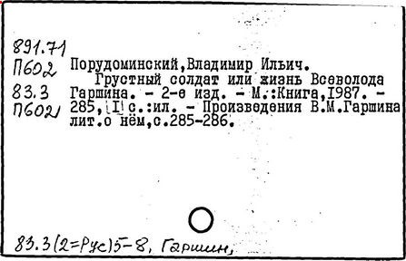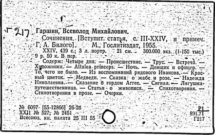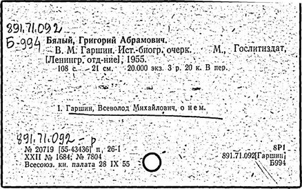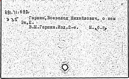 Литература: Памяти Гаршина. Художественно-литературный сборник, СПБ, 1889; Короленко В. Г., В. М. Гаршин, Собр. соч., т. 5, М., 1953; Порудоминский Вл., Гаршин, М., 1962; Евнин Ф. И., Ф. М. Достоевский и В. М. Гаршин, "Изв. АН СССР. ОЛЯ", 1962, т. 21, в, 4; Бялый Г. А., В. М. Гаршин, Л., 1969; Гургулова М., Творчеството на В. М. Гаршин, [София], 1966; История русской литературы XIX в. Библиографич. указатель, М. - Л., 1962.
