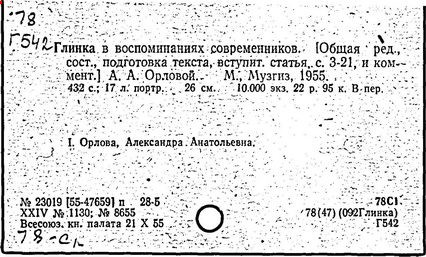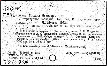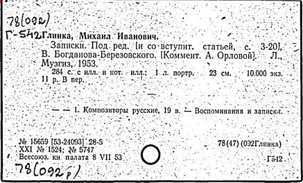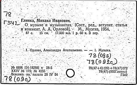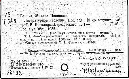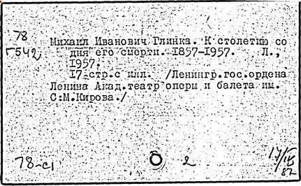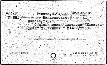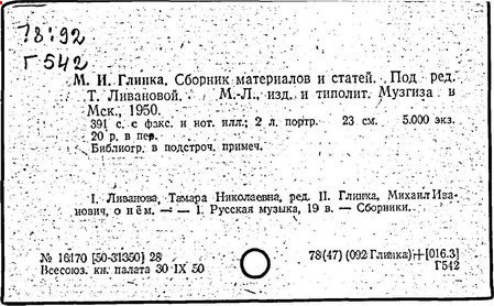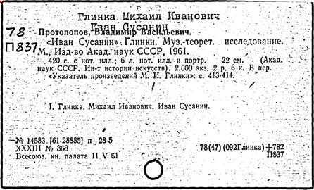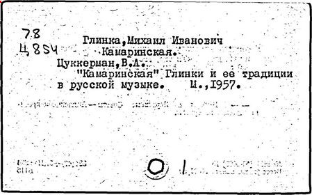 Литература: Кузнецов К. А., Глинка и его современники, М., 1926; Асафьев Б. (Игорь Глебов), Глинка, 2 изд., М., 1950; Серов А. Н., Избранные статьи, т. 1, М.-Л., 1950; М. И. Глинка. Исследования и материалы, под ред. А. В. Оссовского, Л. - М., 1950; М. И. Глинка. Сборник материалов и статей, под ред. Т. Ливановой, М. - Л., 1950; Канн-Новикова Е., М. И. Глинка. Новые материалы и документы, в. 1-3, М. - Л., 1950-55; Одоевский В. Ф., Избранные музыкально-критические статьи. М. - Л., 1951; Стасов В. В., Избранные сочинения, т. 1, М., 1952; Асафьев Б. В., Избранные труды, т. 1, М., 1952; М. И. Глинка. Летопись жизни и творчества, сост. А. Орловой. М., 1952; Ларош Г. А., Избранные статьи о Глинке, М., 1953; Глинка в воспоминаниях современников, общая ред. А. А. Орловой, М., 1955; Ливанова Т., Протопопов В., Глинка, [т. 1-2], М., 1955; Цуккерман В., "Камаринская" Глинки и ее традиции в русской музыке, М., 1957; М. И. Глинка. К 100-летию со дня смерти. 1857-1957, под ред. Е. Гордеевой, М., 1958; Памяти М. И. Глинки, М., 1958: Протопопов Вл., "Иван Сусанин" Глинки. Музыкально-теоретическое исследование, М., 1961.
