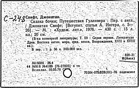 английский писатель. Родился в семье стряпчего. В 1682—1688 учился в Тринити-колледже Дублинского университета. В 1689—1699 секретарь и библиотекарь отставного дипломата и видного эссеиста У. Темпла. С 1695 священник; доктор богословия (1701). В начале 1690-х гг. пробовал силы в поэтических жанрах; сгущённо-пародийный стиль обрёл в прозе. Первое произведение Свифта — памфлет "Битва книг" (1697) — жестокое осмеяние поборников идейной и культурной новизны самоутверждавшейся буржуазной цивилизации. Жанровый поиск "Битвы книг" успешно завершился в "Сказке о бочке" (1704), написанной от лица продажного писаки, составляющего нечто вроде энциклопедии грядущего помешательства. Устами "Автора" Свифт формулирует религиозные, гуманистические, утопические претензии буржуазного прогресса и обнажает их глубинную фальшь. Сказочка о трёх братьях (каждый из которых олицетворяет одну ветвь христианства — католическую, англиканскую или кальвинистскую церковь) становится поводом для бесконечных пародийных отступлений, где уже средствами собственно языка разоблачаются новейшие идейные извращения.