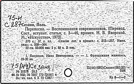 Литература: Воллар А. Сезанн: [пер. с франц.]. Л., 1934; Яворская Н. В. Сезанн. М., 1935; Всеобщая история искусств, т. 6, кн. 1. М., 1965; Перрюшо А. Сезанн: [пер. с франц.; ст. В. Н. Прокофьева]. М., [1966]; [Русакова Р.]. П. Сезанн: [Альбом]. М., 1970; Поль Сезанн. Переписка. Воспоминания современников: [пер. с франц., сост., вступ. ст. и примеч. Н. В. Яворской]. М., 1972; Venturi L. Cézanne. Son art, son oeuvre, v. 1-2. Paris, 1936; Rewald J. The ordeal of P. Cézanne. London, 1950; Badt K. Die Kunst Cézannes. München, 1956; Loran Е. Cézanne's composition. Berk., 1963.