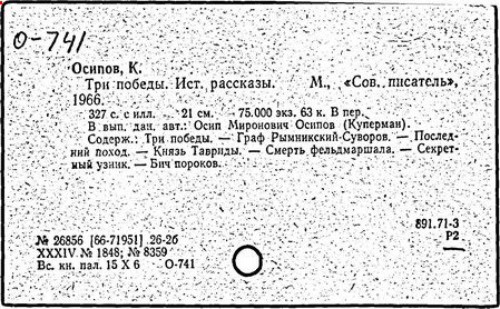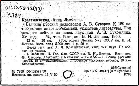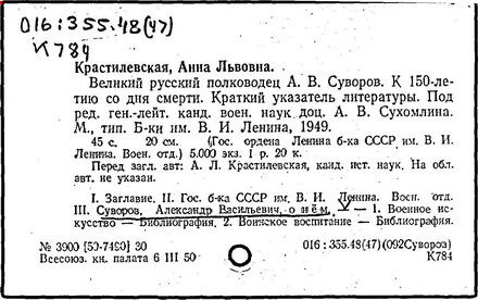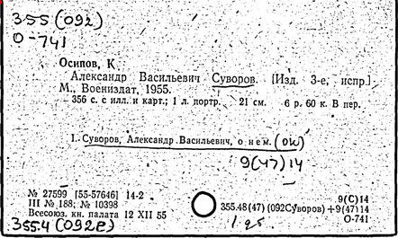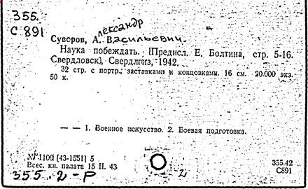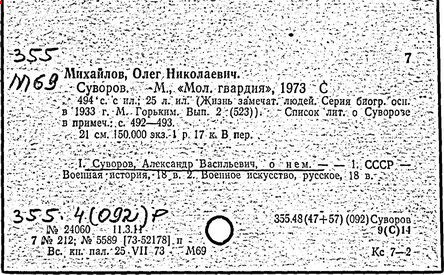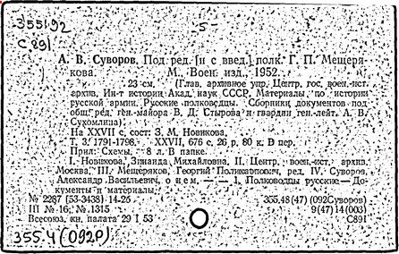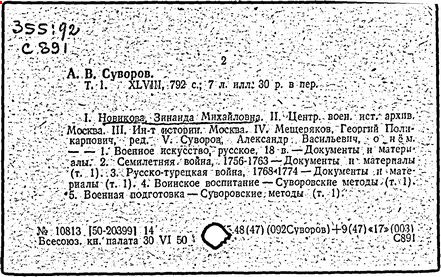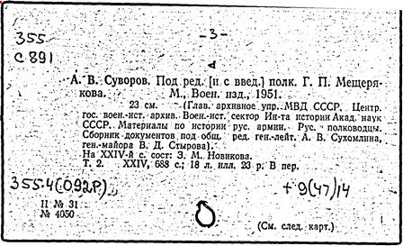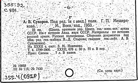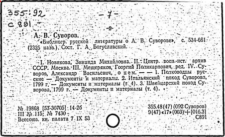 Литература: Милютин Д. А., История войны 1799 г. между Россией и Францией в царствование императора Павла 1, 2 изд., т. 1-3, СПБ, 1857; Петрушевский и А. Ф., Генералиссимус князь Суворов, 2 изд., СПБ, 1900; Суворов в сообщениях профессоров Николаевской академии генерального штаба 1800 г.-6 мая 1900 г., [кн. 1-2], СПБ, 1900-01: Боголюбов А. Н., Полководческое искусство А. В. Суворова, М., 1939; Осипов К., Суворов, 3 изд., М., 1955: Мещеряков Г. П. и Бескровный Л. Г., А. В. Суворов, [М.], 1946; Никольский Г. С., Суворовская "Наука побеждать", М., 1949: А. В. Суворов. Из материалов, опубликованных в связи со 150-летием со дня смерти 1800-1950, М., 1951; Суворовский сборник, М., 1951.