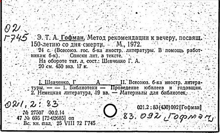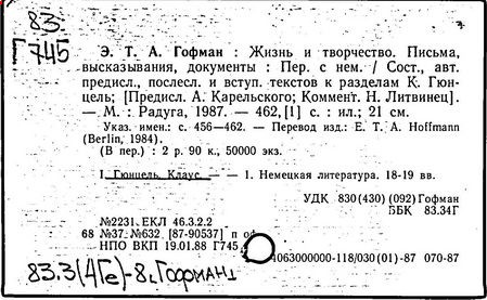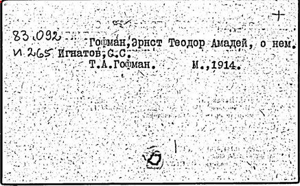 Литература: Герцен А. И., Гофман, Собр. соч. в 30 томах, т. 1, М., 1954; Миримский И., Романтизм Э. Т. А. Гофмана, «Уч. зап. Московского гос. педагогического института. Кафедра истории всеобщей литературы», 1937, в. 3; Браудо Е. М., Э. Т. А. Гофман, П., 1922; Иванов-Борецкий М. В., Э. Т. А. Гофман 1776— 1822, Музыкальное образование, 1926, № 3—4; Ферман В. Э., Немецкая романтическая опера, в его кн.: Оперный театр. Статьи и исследования, М., 1961; Weiner Н. G., Е. Т. A. Hoffmann, Weimar, 1962; Voerster J., 160 Jahre E. T. A.Hoffmann-Forschung 1805—1965, Stuttg., 1967; E. T. A. Hoffmanns Leben und Werk in Daten und Bildern, Fr./M., [1968]; Piana Theo, E. T. A. Hoffmann als bildender Künstler, B., 1954; Moos P., E. T. A. Hoffmann als Musikästhetiker, «Die Musik», 1907, 6 Jg, April, S. 67-84; Ehinger H., E. T. A. Hoffmann als Musiker und Musikschriftsteller, Köln, 1954.