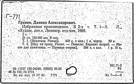 Печататься начал в 1949 г. Основная тема произведений Гранина - романтика и поэзия научно-технического творчества, борьба между ищущими, принципиальными, подлинными учёными и людьми недаровитыми, карьеристами, бюрократами: романы «Искатели» (1954 г.) и «Иду на грозу» (1962 г.). Роман «После свадьбы» (1958 г.) посвящен судьбе молодого изобретателя, посланного комсомолом на работу в деревню. Все три романа инсценировались для театра, по ним сделаны одноименные фильмы. Написал рассказы и повести «Победа инженера Корсакова» (опубликована в 1949 г. под названием «Спор через океан»), «Вариант второй» (1949 г.), «Ярослав Домбровский» (1951 г.), «Собственное мнение» (1956 г.), книги очерков о поездках в ГДР, Францию, на Кубу, в Австралию, Англию - «Неожиданное утро» (1962 г.) и «Примечания к путеводителю» (1967 г.), рассказ «Дом на Фонтанке» (1967 г.), повесть «Наш комбат» (1968 г.), раздумья о «Медном всаднике» А. С. Пушкина - «Два лика» (1968 г.), художественно-документальное произведение: «Эта странная жизнь» (1974 г., о биологе А. А. Любищеве), «Клавдия Вилор» (1976 г., Государственная премия СССР), роман «Зубр» (1987 г., о судьбе биолога Н. В. Тимофеева-Ресовского), «Блокадная книга», ч.1-2 (1977-1981 гг., совместно с А. М. Адамовичем). В романе «Картина» (1979 г.) и в повести «Неизвестный человек» (1990 г.) затронуты проблемы сохранения исторической памяти, предпринят анализ состояния человека, теряющего свое место в социальной иерархии. «Повесть об одном ученом и одном императоре» - биография Араго (1991 г.). Шпионский роман «Бегство в Россию» (1994 г.). Повесть «Оборванный след» - о жизни ученых в современной России (2000 г.). Эссе «Страх» - о преодолении тоталитаризма и коммунизма. Награжден 3 орденами, а также медалями.