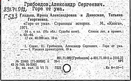 Крепостническому дворянству, как и поверхностному дворянскому либерализму (образ Репетилова), противопоставлен Чацкий, которого А. И. Герцен назвал декабристом. В его образе Грибоедов отразил протест против деспотизма, борьбу за национальную самобытность русской культуры против рабского преклонения перед иностранным. Царская цензура не разрешила печатание комедии; в 1825 г. были опубликованы лишь отрывки из неё в альманахе "Русская Талия"; первое издание, урезанное цензурой, появилось в 1833 г. (полный текст опубликован в 1862 г.). Комедия стала расходиться в списках. Декабристы распространяли её в целях пропаганды своих идей. В глазах последующих поколений Чацкий стал символом протеста против всего отжившего и реакционного, борьбы за новое, передовое.