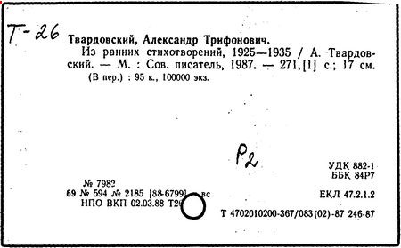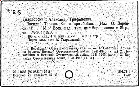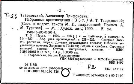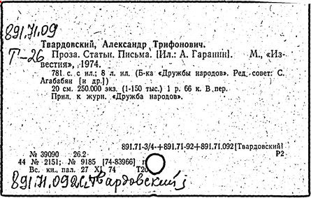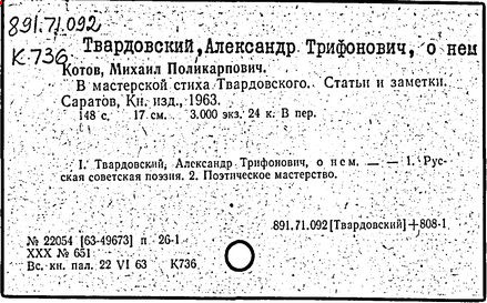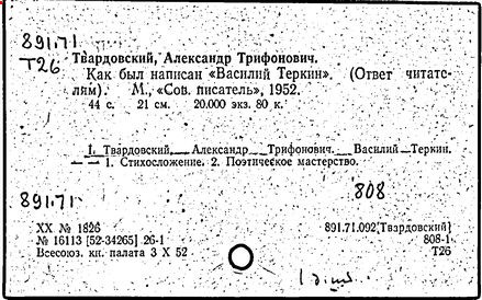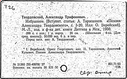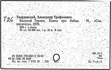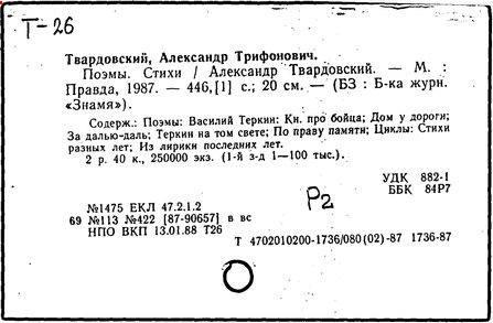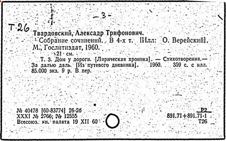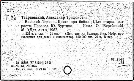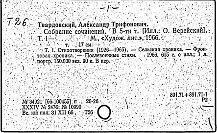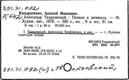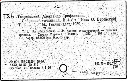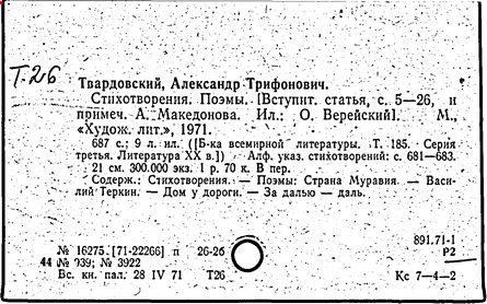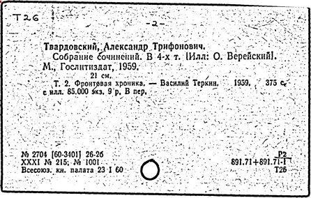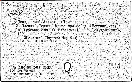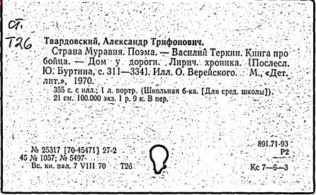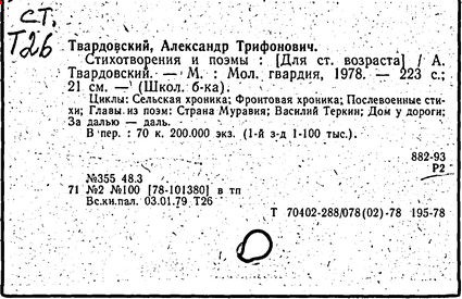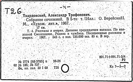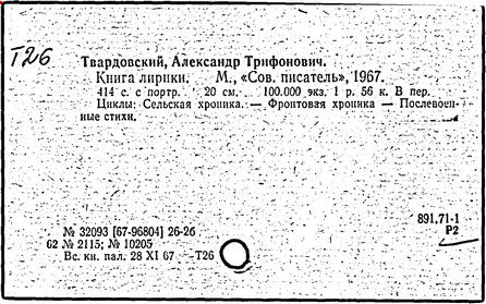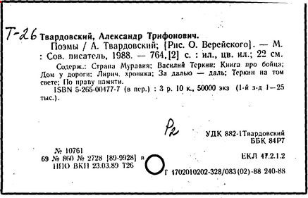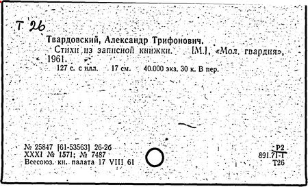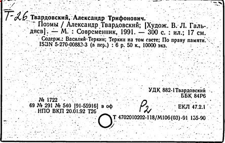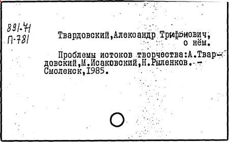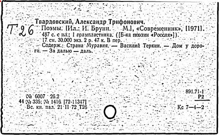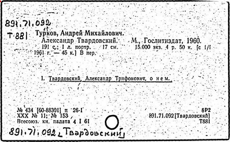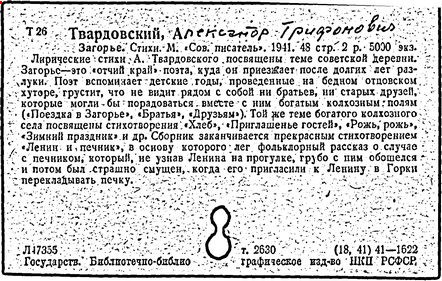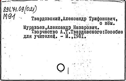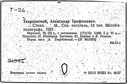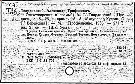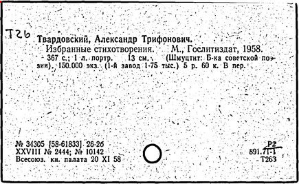 русский советский поэт и общественный деятель. Родился на хуторе Загорье (ныне Починковский район Смоленской области). Сын сельского кузнеца. Учился в Смоленском педагогическом институте; в 1939 г. окончил Московский институт истории, философии и литературы (МИФЛИ). Писать стихи начал с раннего детства; с 1924 г. – селькор, печатавший в местных газетах корреспонденции, стихи, очерки. Судьба крестьянина в годы коллективизации – тема первых поэм Твардовского "Путь к социализму" (1931 г.) и "Вступление" (1933 г.), "Сборника стихов. 1930-1935" (1935 г.), повести "Дневник председателя колхоза" (1932 г.) – с наибольшей художественной силой воплотилась в поэме "Страна Муравия" (1936 г.; Государственная премия СССР, 1941 г.). Её герой Никита Моргунок не только наблюдает во время своих странствий картину "великого перелома", но и сам воплощает драму расставания с прежними надеждами и иллюзиями. В стиле поэмы своеобразно преломились символика и гиперболизм сказки; её язык богат образами, идущими от восприятия мира крестьянином. В лирике 30-х гг. (сборники "Сельская хроника", 1939 г.; "Загорье", 1941 г., и др.) Твардовский стремился уловить изменения в характерах людей колхозной деревни, выразить владевшие ими чувства. Участие в советско-финляндской войне 1939 – 1940 гг. в качестве корреспондента военной печати подготовило обращение Твардовского к теме советского воина: цикл стихов "В снегах Финляндии" (1939 – 1940 гг.), прозаические записи "С Карельского перешейка" (опубликованы в 1969 г.). Во время Великой Отечественной войны 1941 – 1945 гг. Твардовский работал во фронтовых газетах, публикуя в них стихи ("Фронтовая хроника") и очерки. В поэме "Василий Тёркин (Книга про бойца)" (1941 – 1945 гг.; Государственная премия СССР, 1946 г.) фольклорная фигура бойкого, бывалого солдата претворена в эпически ёмкий образ, воплотивший глубину, значительность, многообразие мыслей и чувств так называемых рядовых, простых людей военного времени. Богатству натуры героя отвечает гибкость избранного поэтом жанра; картины, исполненные огромного трагизма, перемежаются проникновенными лирическими отступлениями или лукавой, сердечной шуткой. "Это поистине редкая книга, – писал И. А. Бунин. – Какая свобода, какая чудесная удаль, какая меткость, точность во всём и какой необыкновенный народный солдатский язык – ни сучка, ни задоринки, ни единого фальшивого, готового, то есть литературно-пошлого слова!" ("Литературный Смоленск", 1956, книга 15, с. 325-26). Ярко выразившая нравственные идеалы народа, книга получила всенародную известность, вызвала многочисленные подражания, стихотворные "продолжения".