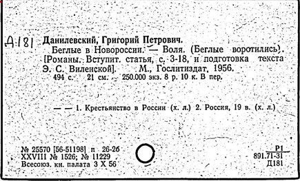 русский и украинский писатель. Родился в с. Даниловка, ныне Харьковской обл. в семье украинского помещика. Окончил в 1850 г. Петербургский университет. Впоследствии крупный чиновник. В 1869-1890 гг. редактор официальной газеты "Правительственный вестник". Известны романы Данилевского "Беглые в Новороссии" (1862 г.), "Воля" ("Беглые воротились", 1863 г., под псевдонимом А. Скавронский), правдиво изображающие борьбу крестьян против крепостного права. С конца 70-х гг. Данилевский писал исторические романы: "Мирович" (1879 г.), "Княжна Тараканова" (1883 г.), "Сожжённая Москва" (1886 г.). Умение воссоздать быт эпохи, занимательность сюжетов обусловили популярность его романов, несмотря на ограниченность исторической концепции Данилевского.