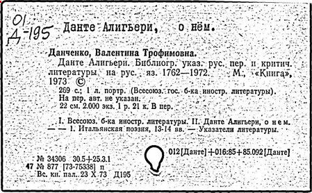 Литература: Веселовский А. Н., Данте, в его кн.: Избр. статьи, Л., 1939; Алпатов М. В., Итальянское искусство эпохи Данте и Джотто, М.-Л., 1939; Дживелегов А. К., Данте Алигьери, 2 изд., М., 1946; Де Санктис Ф., История итальянской литературы, пер. с итал., под ред. Д. Е. Михальчи, т. 1, М., 1963; Данте и славяне, [сб. статей под общей ред. И. Бэлзы], М., 1965; Едина Н., Данте, М., 1965; Годенищев-Кутузов И. Н., Данте, М., 1967; его же, Творчество Данте и мировая культура, М., 1971; Данте и всемирная литература. [Сб. статей] , М., 1967: Дантовские чтения. [Сб. статей], под общей ред. И. Бэлзы. [в. 1-2], М., 1968-71 (см. библ. советской дантологии. Сост. Ю. И. Ритчик, в. 1): Алексеев М. П., Первое знакомство с Данте в России, в кн.: От классицизма к романтизму, Л.,1970: Vossler К., Die Göttliche Komödie.Bd 1-2, Heidelberg, 1907-10; Carducci G., Dante e l'eta che fu sua, в его кн.: Prose, 4 ed., Bologna, 1908: Zingarelli N., La vita, i tempi, le opere di Dante, Mil., 1931; Nardi B., Dante e la cultura medievale, 2 ed. , Bari, 1949; Renaudet A., Dante humaniste. P., 1952; Apollonio М., Dante. Storia della "Commedia", 2 ed., pt 1-2, Mil., 1954; Barbi M., Problemi fondamentali per un nuovo commento della "Divina Commedia", Firenze, 1955; Croce B., La poesia di Dante, [9 ed.], Bari, 1958; Cosmo U., Guida a Dante, Firenze, 1962; Auerbach E., Studi su Dante, Mil., 1963; Attidel Congresso internazionale di studi danteschi, v. 1-2, Firenze, 1965-66; Pagliaro A., Ulisse. Ricerche semantiche sulla Divina commedia, t. 1-2, Messina - Firenze, [1967]; Rossi M., Problematica della Divina commedia, Firenze, 1969. Библиографические издания: Данте в СССР. Библиография переводов и критической литературы, 1918-1964, сост. И. В. Голенищева-Кутузова, М., 1965.