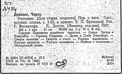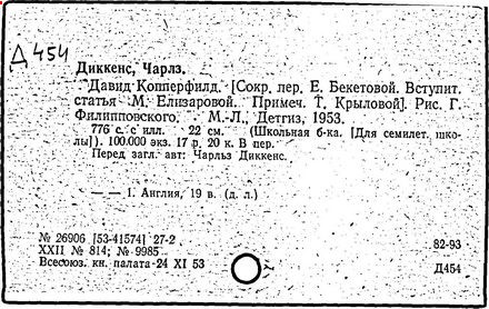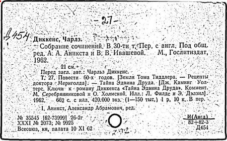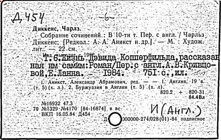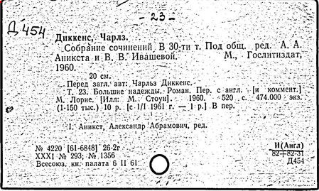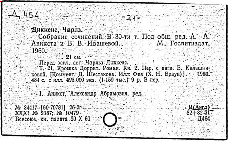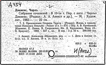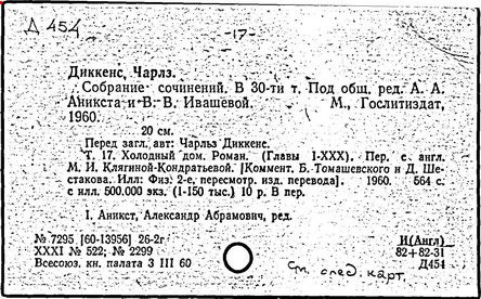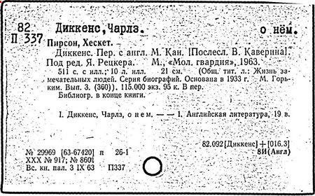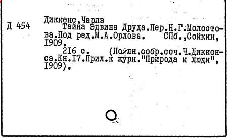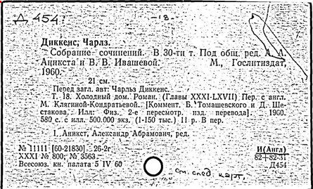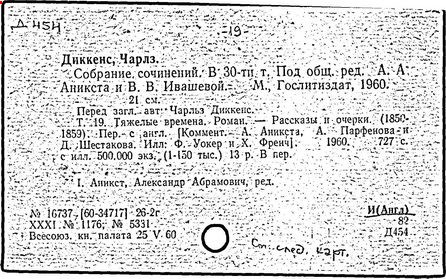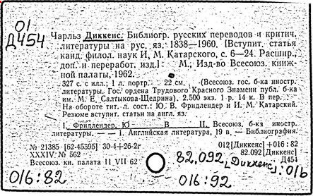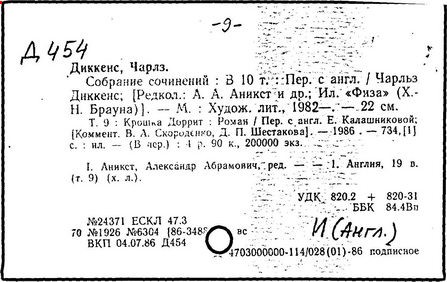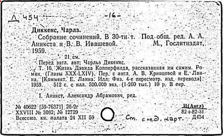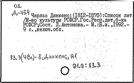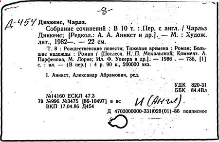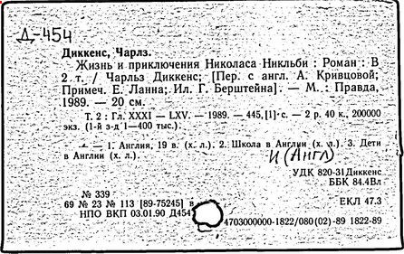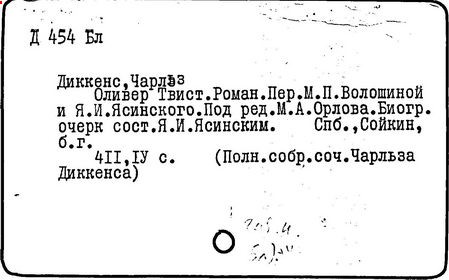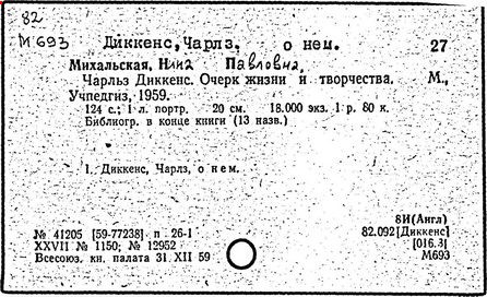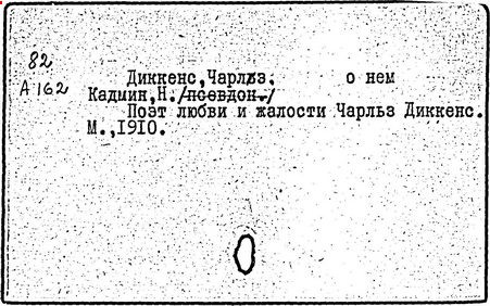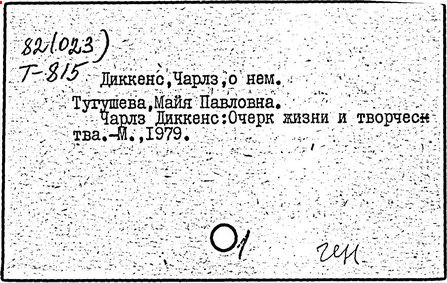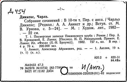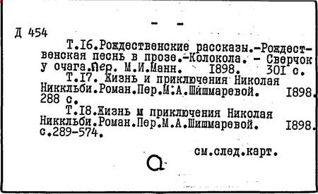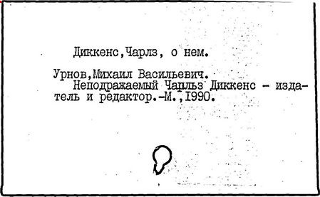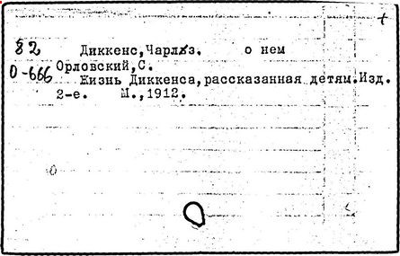 Почти все написанное Диккенса переведено на русский язык и в свое время появлялось в журналах, а затем и отдельными изданиями. Лучшим переводчиком Диккенса следует признать Иринарха Введенского ("Замогильные записки Пиквикского клуба", 3-е изд., М., 1884; "Давид Копперфильд", ibid.; "Домби и сын" — "Современник", 1847 и отд., 1848), художественный перевод которого, однако, часто отступает от оригинала. В настоящее время (1893) выходит полное собрание сочинений Диккенс в переводе Ранцова (изд. Павленкова). Лучшие биографии Диккенса на англ. яз.: Forster, "Life of Charles D." (Л., 1871-72; в "Русском Вестнике", 1873, 2-4) и Marzials, "Life of D." (в коллекции "Great Writers"). Его старшей дочерью изд. (1880) "The letters of Ch. D.". Ср. также F.G. Kitton, "Dickensiana: A bibliography of the literature relating to Ch. D. and his writings" (1886); биография Д. (в "Соврем.", 1852, т. 31-й) "Смерть Д." ("Дело", 1870, 6, Реклю); "Русский Вестн.", 1870, 6, Нелюбова; "Детство и молодость Д." ("Вестн. Европы", 1872, 6); биография Д. Анненковой (1893), в коллекции изд. Павленкова. Ряд статей о Д., Я. П. Полонского в "Сев. Вестнике" (1889-90); А. Кирпичникова, "Д. как педагог" (Харьков, 1889; перепечатано в его книге "Педагогические очерки") и Линниченко, "Обзор политич. деятельности англ. романиста Д." ("Киевского унив. изв.", 1866).