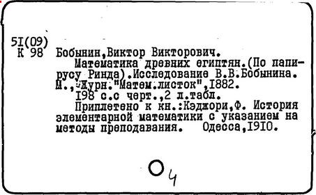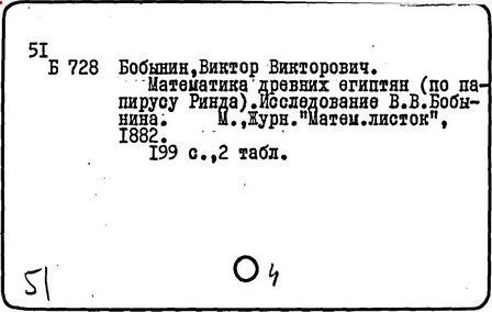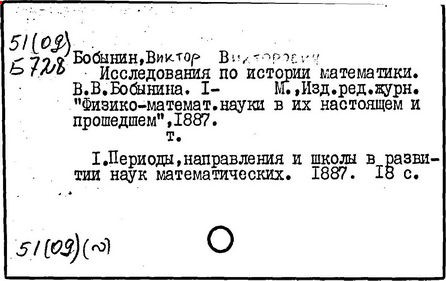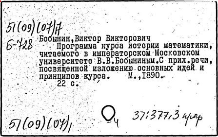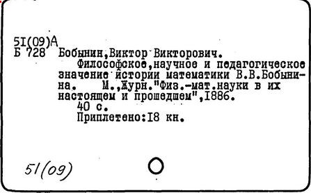 В 1882 г. им было выпущено капитальное сочинение "Математика древних египтян", в котором он дал очень ценное исследование незадолго до того открытого и изданного древнеегипетского математического папируса из собрания Ринда. С 1883 г. Бобынин – приват-доцент по истории математики в Московском университете. В 1885 г. Бобынин основал и издавал журнал "Физико-математические науки, в их прошедшем и настоящем состоянии". В этом журнале Бобынин поместил ряд исследований по истории математики в России. Этому же предмету посвящено и отдельное сочинение его – "Очерки развития физико-математических знаний в России" (вып. I – 1886 г., вып. II – 1893 г.).