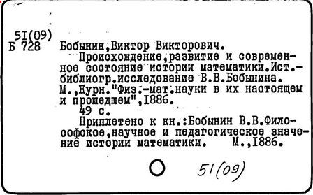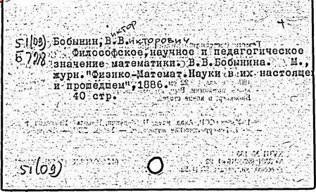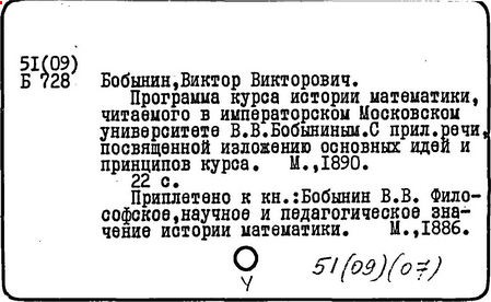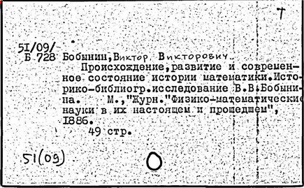 историк математики. Родился в Смоленской губ.. Окончил Московский университет в 1872 г. После небольшого числа работ по прикладной математике и метеорологии Бобынин занялся по преимуществу историей математики.