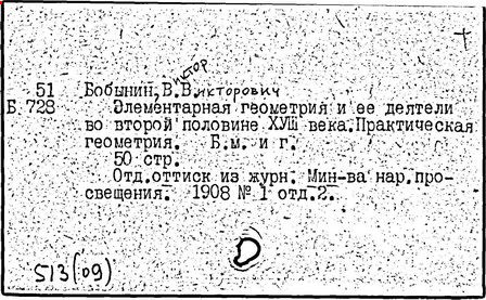 Очень большое значение имеет фундаментальный труд Бобынина "Русская физико-математическая библиография" (1886 – 1895 гг.); в нем обозрение литературы доведено до 1810 г. Целый ряд монографий, напечатанных в русских и западных журналах, доставили Бобынину европейскую известность. Для 4-го тома известной истории математики М. Кантора ("Vorlesungen über Geschichte der Mathematik") Бобынин написал историю элементарной геометрии в 18 веке (извлечение – в "Журнале Министерства народного просвещения", № 11, 1907 г.).