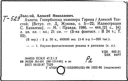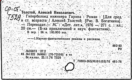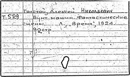В 1920-х годах Толстой опубликовал ряд фантастических произведений: повесть Аэлита (1922–1923), изображение социального переворота на Марсе; пьесу Бунт машин (1925) и роман Гиперболоид инженера Гарина (1925–1927), об ученом, страдающем манией величия и пытающемся поработить мир. В рассказе Голубые города (1925) описывается противоборство современной науки и патриархальной российской деревни. Трилогия Хождение по мукам, начатая в Париже в 1921 и завершенная в 1941, – его важнейшее произведение, реалистическая картина жизни российского общества, в особенности интеллигенции, во время войны и революции. Его Петр I (кн. 1–3, 1929–1945, незаконч.) считается лучшим историческим романом советского периода в истории русской литературы.