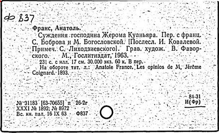 Литература: История французской литературы, т. 3, М., 1959; Луначарский А. В., Писатель иронии и надежды, в его кн.: Статьи о литературе, М., 1957; Дынник В., Анатоль Франс. Творчество, М. - Л., 1934; Фрид Я., Анатоль Франс и его время, М., 1975; Corday М., A. France d'après ses confidences et ses souvenirs, P., [1927]; Seilliere Е., A. France, critique de son temps, P., 1934; Suffel J., A. France, P., 1946; его же, A. France par luimême, [P., 1963]; Cachin M., Humaniste - socialiste - communiste,"Les Lettres françaises", 1949, 6 Oct., № 280; "Europe", 1954, № 108 (номер посвящен А. Франсу); Ubersfeld A., A. France: De l'humanisme bourgeois à l'humanisme socialiste, "Cahiers du communisme", 1954, № 11-12; Vandegans A., A. France. Les années de formation, P., 1954; Levaililant J., Les aventures du scepticisme. Essai sur l’évolution intellectuelle d’A. France, [P., 1965]; Lion J., Bibliographie des ouvrages consacrés à A. France, P., 1935.