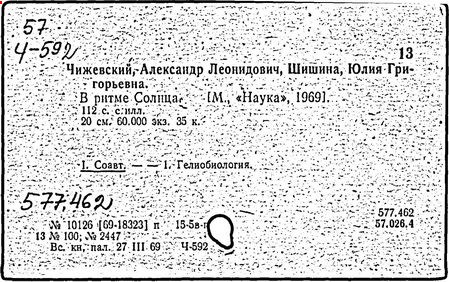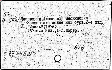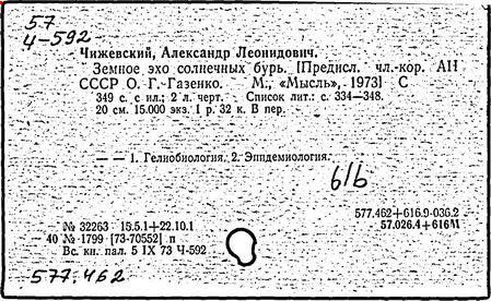 Литература: Солнце, электричество, жизнь. Сб., в. 1—3, М., 1969—76; Голованов Л. В., Вклад А. Л. Чижевского в космическую биологию. Труды 3-й Всесоюзной конференции по авиационной и космической медицине, т. 3, М., 1969.